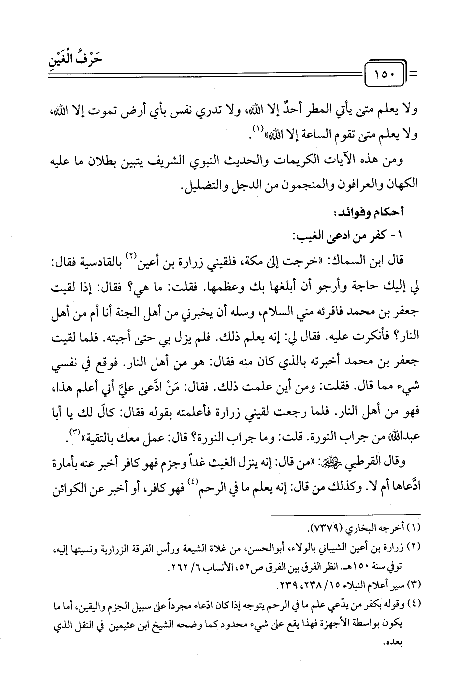 (¬٤) وقوله بكفر من يدّعي علم ما في الرحم يتوجه إذا كان ادّعاء مجردًا على سبيل الجزم واليقين، أما ما يكون بواسطة الأجهزة فهذا يقع على شيء محدود كما وضحه الشيخ ابن عثيمين في النقل الذي بعده.