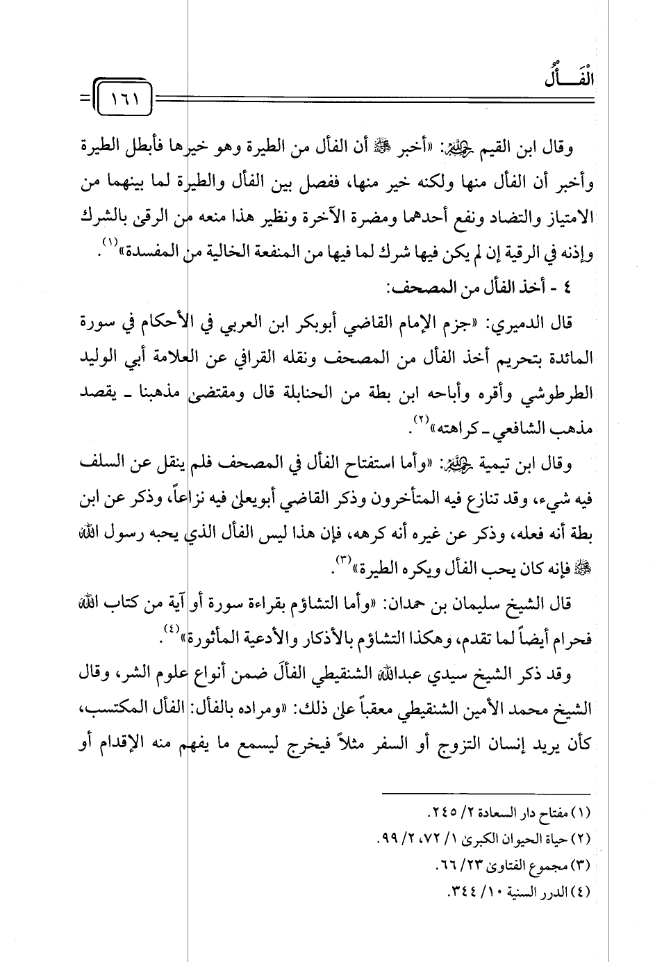 وقال ابن تيمية - رحمه الله -: "وأما استفتاح الفأل في المصحف فلم ينقل عن السلف فيه شيء، وقد تنازع فيه المتأخرون وذكر القاضي أبو يعلى فيه نزاعًا، وذكر عن ابن بطة أنه فعله، وذكر عن غيره أنه كرهه، فإن هذا ليس الفأل الذي يحبه رسول الله - صلى الله عليه وسلم - فإنه كان يحب الفأل ويكره الطيرة" (¬٣).
