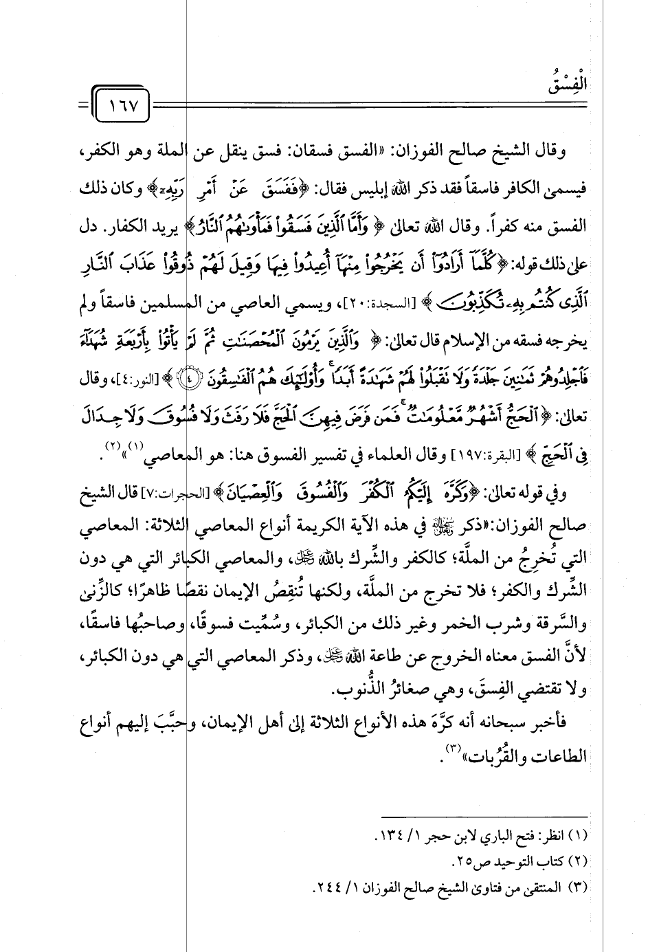 وفي قوله تعالى: {وَكَرَّهَ إِلَيْكُمُ الْكُفْرَ وَالْفُسُوقَ وَالْعِصْيَانَ} [الحجرات: ٧] قال الشيخ صالح الفوزان: "ذكر - سبحانه وتعالى - في هذه الآية الكريمة أنواع المعاصي الثلاثة: المعاصي التي تُخرِجُ من الملَّة؛ كالكفر والشِّرك بالله - عز وجل -، والمعاصي الكبائر التي هي دون الشِّرك والكفر؛ فلا تخرج من الملَّة، ولكنها تُنقِصُ الإيمانْ نقصًا ظاهرًا؛ كالزِّنى والسَّرقة وشرب الخمر وغير ذلك من الكبائر، وسُمِّيت فسوقًا، وصاحبُها فاسقًا، لأنَّ الفسق معناه الخروج عن طاعة الله - عز وجل -، وذكر المعاصي التي هي دون الكبائر، ولا تقتضي الفِسقَ، وهي صغائرُ الذُّنوب.