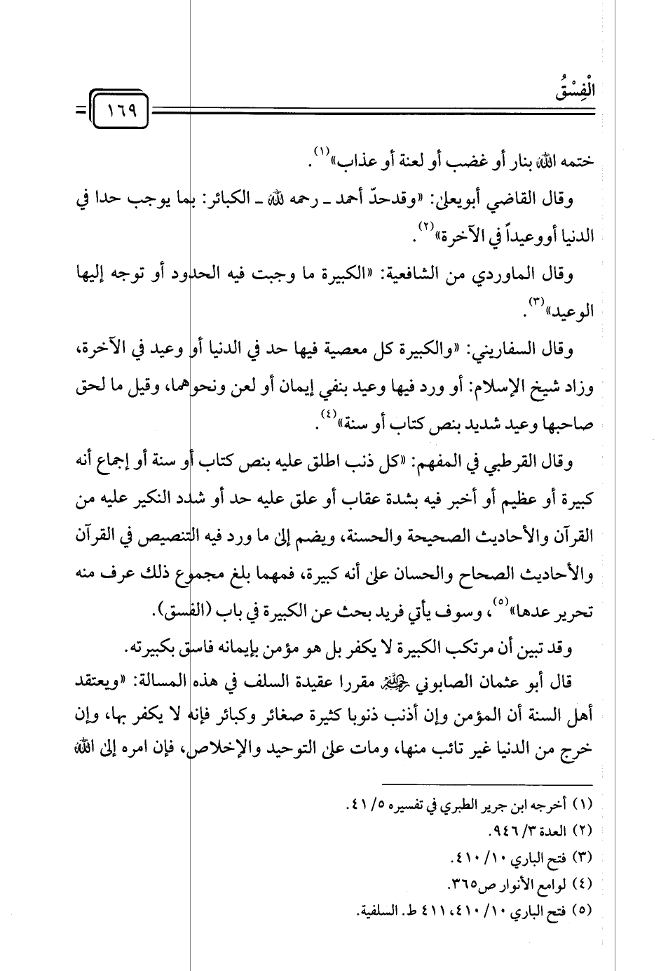 وقال القرطبي في المفهم: "كل ذنب أطلق عليه بنص كتاب أو سنة أو إجماع أنه كبيرة أو عظيم أو أخبر فيه بشدة عقاب أو علق عليه حد أو شدد النكير عليه من القرآن والأحاديث الصحيحة والحسنة، ويضم إلى ما ورد فيه التنصيص في القرآن والأحاديث الصحاح والحسان على أنه كبيرة، فمهما بلغ مجموع ذلك عرف منه تحرير عدها" (¬٥)، وسوف يأتي فريد بحث عن الكبيرة في باب (الفسق).