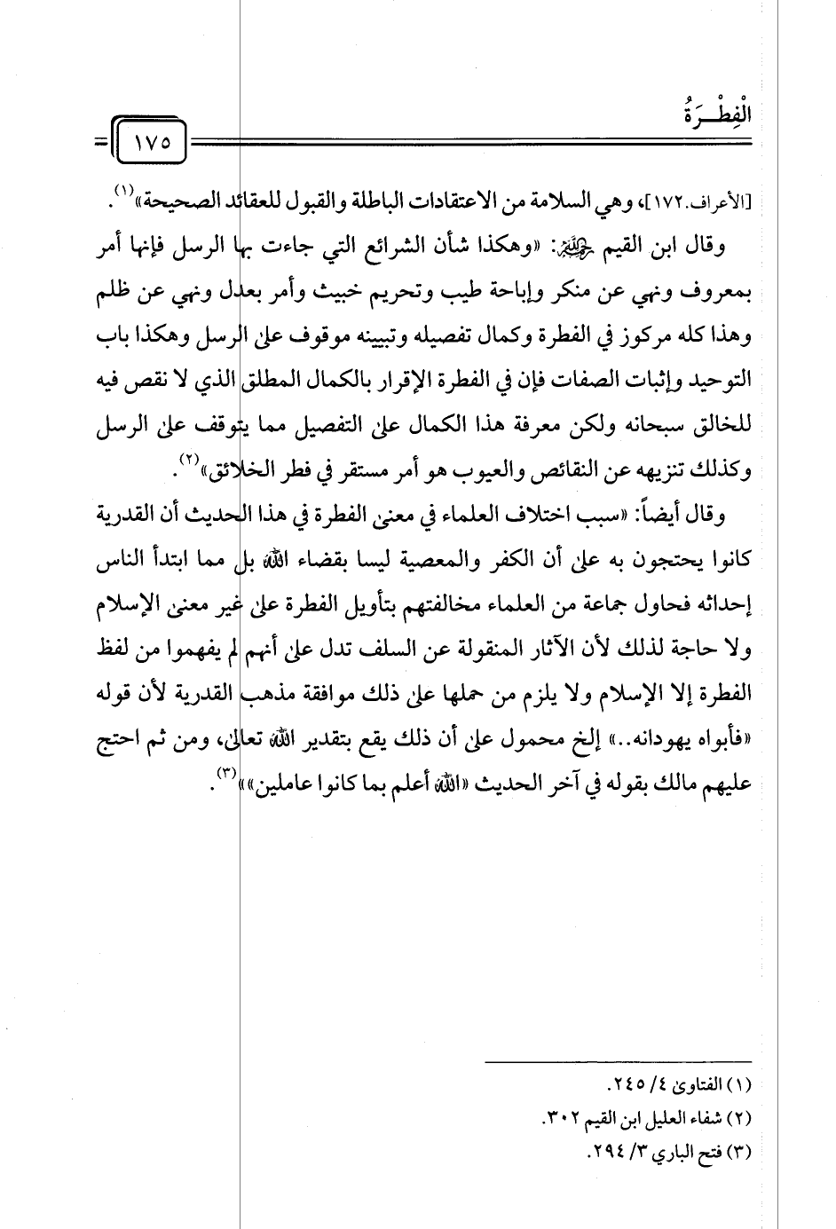 [الأعراف. ١٧٢]، وهي السلامة من الاعتقادات الباطلة والقبول للعقائد الصحيحة" (¬١).