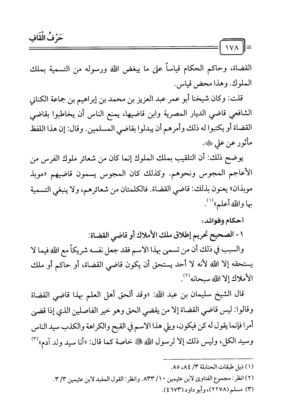 يوضح ذلك: أن التلقيب بملك الملوك إنما كان من شعائر ملوك الفرس من الأعاجم المجوس ونحوهم. وكذلك كان المجوس يسمون قاضيهم "موبذ موبذان" يعنون بذلك: قاضي القضاة. فالكلمتان من شعائرهم، ولا ينبغي التسمية بها والله أعلم" (¬١).