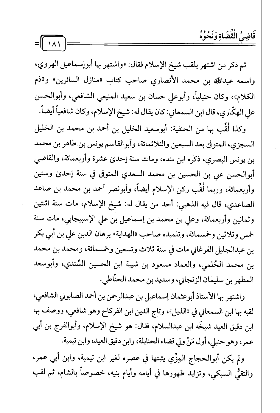 ثم ذكر من اشتهر بلقب شيخ الإسلام فقال: "واشتهر بها أبو إسماعيل الهروي، واسمه عبد الله بن محمد الأنصاري صاحب كتاب "منازل السائرين" و"ذم الكلام"، وكان حنبليًا، وأبو علي حسان بن سعيد المنيعي الشافعي وأبو الحسن علي الهكّاري، قال ابن السمعاني: كان يقال له: شيخ الإسلام، وكان شافعيًا أيضًا.