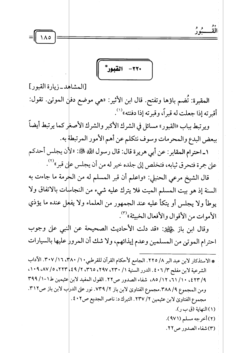 ١ - احترام المقابر: عن أبي هريرة قال: قال رسول الله - صلى الله عليه وسلم -: "لأن يجلس أحدكم على جمرة فتحرق ثيابه، فتخلص إلى جلده خير له من أن يجلس على قبر" (¬٢).