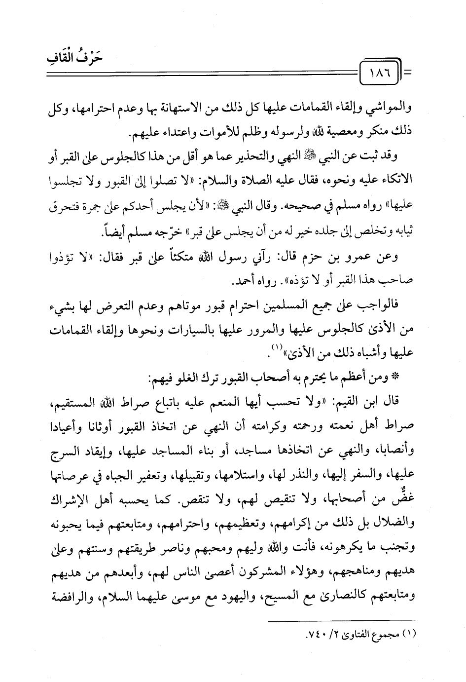 قال ابن القيم: "ولا تحسب أيها المنعم عليه باتباع صراط الله المستقيم، صراط أهل نعمته ورحمته وكرامته أن النهي عن اتخاذ القبور أوثانا وأعيادا وأنصابا، والنهي عن اتخاذها مساجد، أو بناء المساجد عليها، وإيقاد السرج عليها، والسفر إليها، والنذر لها، واستلامها، وتقبيلها، وتعفير الجباه في عرصاتها غضٌّ من أصحابها، ولا تنقيص لهم، ولا تنقص. كما يحسبه أهل الإشراك والضلال بل ذلك من إكرامهم، وتعظيمهم، واحترامهم، ومتابعتهم فيما يحبونه وتجنب ما يكرهونه، فأنت والله وليهم ومحبهم وناصر طريقتهم وسنتهم وعلى هديهم ومناهجهم، وهؤلاء المشركون أعصى الناس لهم، وأبعدهم من هديهم ومتابعتهم كالنصارى مع المسيح، واليهود مع موسى عليهما السلام، والرافضة