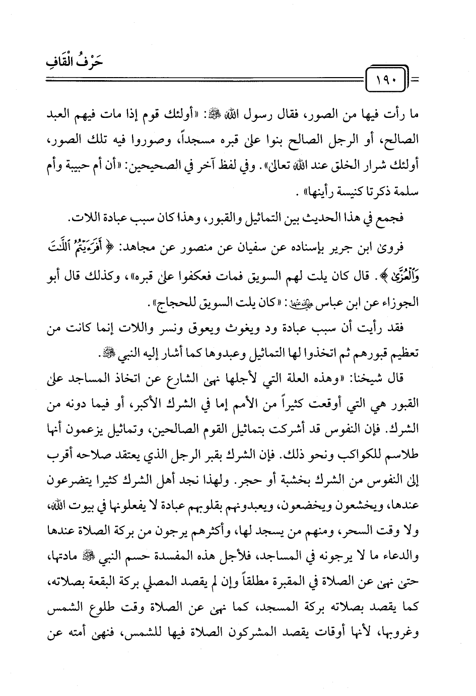 قال شيخنا: "وهذه العلة التي لأجلها نهى الشارع عن اتخاذ المساجد على القبور هي التي أوقعت كثيرًا من الأمم إما في الشرك الأكبر، أو فيما دونه من الشرك. فإن النفوس قد أشركت بتماثيل القوم الصالحين، وتماثيل يزعمون أنها طلاسم للكواكب ونحو ذلك. فإن الشرك بقبر الرجل الذي يعتقد صلاحه أقرب إلى النفوس من الشرك بخشبة أو حجر. ولهذا نجد أهل الشرك كثيرا يتضرعون عندها، ويخشعون ويخضعون، ويعبدونهم بقلوبهم عبادة لا يفعلونها في بيوت الله، ولا وقت السحر، ومنهم من يسجد لها، وأكثرهم يرجون من بركة الصلاة عندها والدعاء ما لا يرجونه في المساجد، فلأجل هذه المفسدة حسم النبي - صلى الله عليه وسلم - مادتها، حتى نهى عن الصلاة في المقبرة مطلقًا وإن لم يقصد المصلي بركة البقعة بصلاته، كما يقصد بصلاته بركة المسجد، كما نهى عن الصلاة وقت طلوع الشمس وغروبها، لأنها أوقات يقصد المشركون الصلاة فيها للشمس، فنهى أمته عن