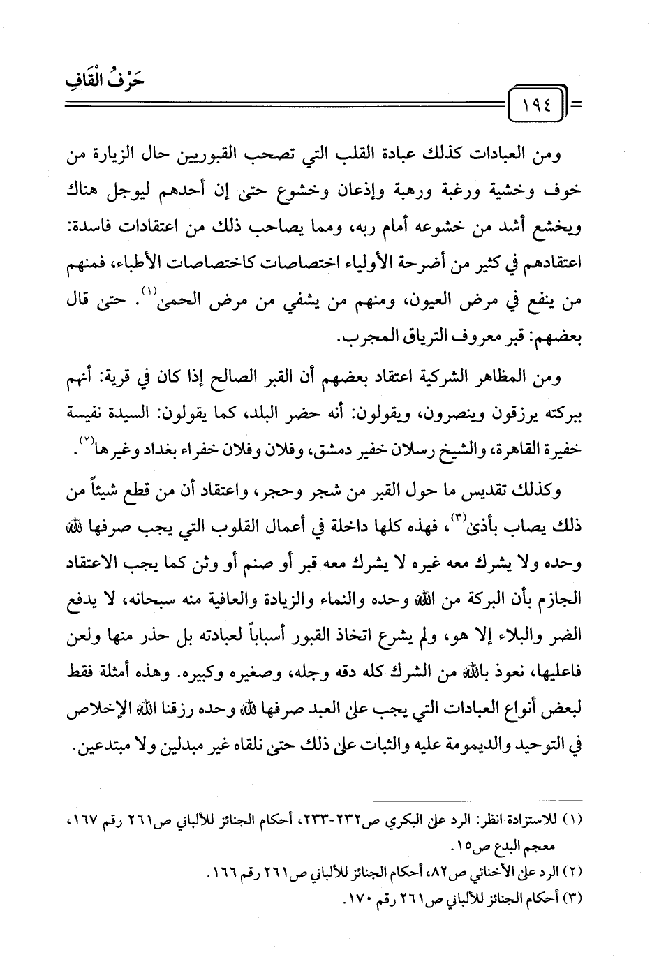 وكذلك تقديس ما حول القبر من شجر وحجر، واعتقاد أن من قطع شيئًا من ذلك يصاب بأذى (¬٣)، فهذه كلها داخلة في أعمال القلوب التي يجب صرفها لله وحده ولا يشرك معه غيره لا يشرك معه قبر أو صنم أو وثن كما يجب الاعتقاد الجازم بأن البركة من الله وحده والنماء والزيادة والعافية منه سبحانه، لا يدفع الضر والبلاء إلا هو، ولم يشرع اتخاذ القبور أسبابًا لعبادته بل حذر منها ولعن فاعليها، نعوذ بالله من الشرك كله دقه وجله، وصغيره وكبيره. وهذه أمثلة فقط في أنواع العبادات التي يجب على العبد صرفها لله وحده رزقنا الله الإخلاص في التوحيد والديمومة عليه والثبات على ذلك حتى نلقاه غير مبدلين ولا مبتدعين.