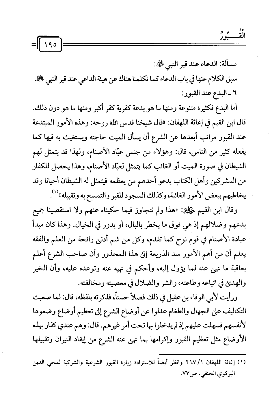 (¬١) إغاثة اللهفان ١/ ٢١٧ وانظر أيضًا للاستزادة زيارة القبور الشرعية والشركية لمحي الدين البركوي الحنفي، ص ٧٧.
