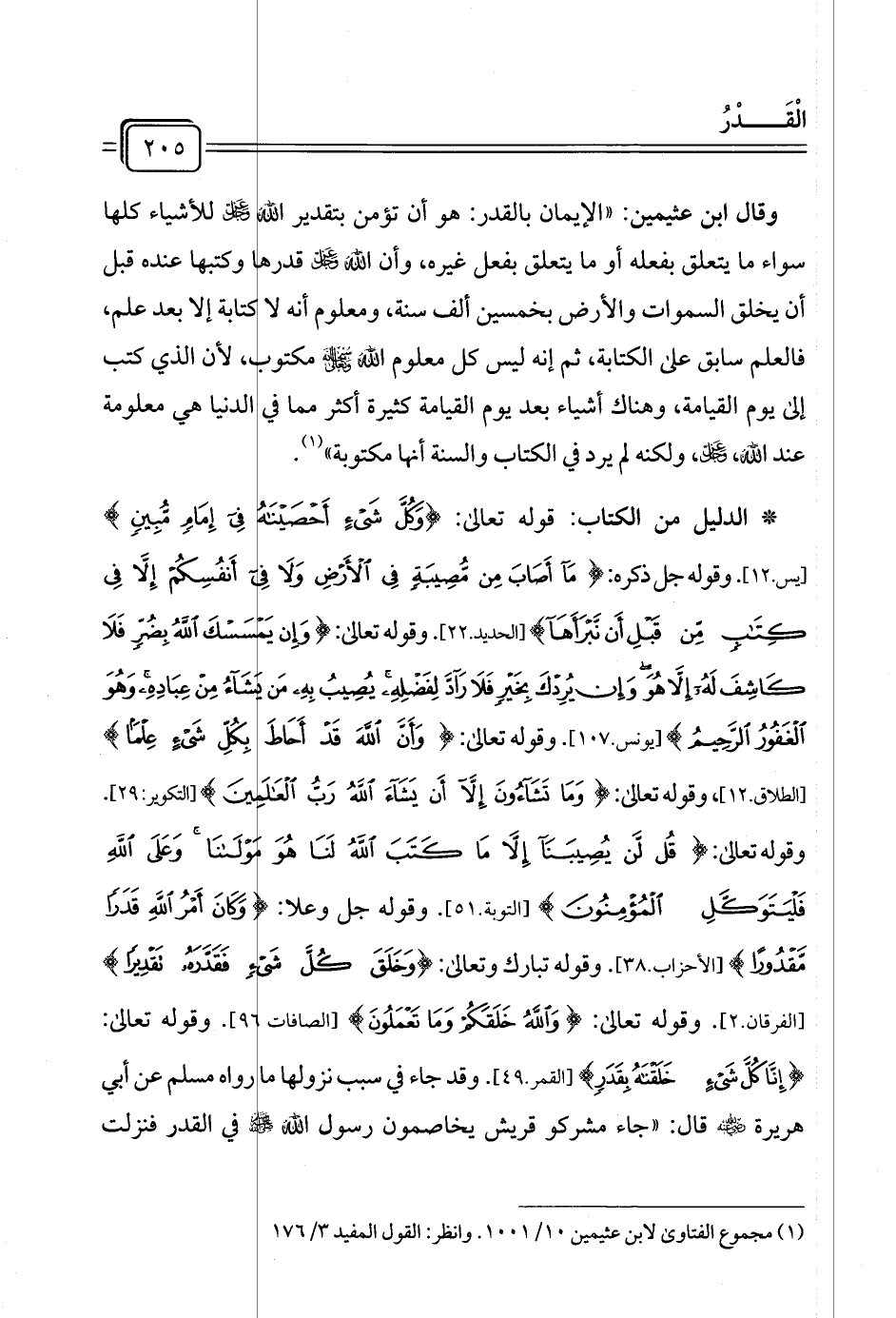 وقال ابن عثيمين: "الإيمان بالقدر: هو أن تؤمن بتقدير الله عز وجل للأشياء كلها سواء ما يتعلق بفعله أو ما يتعلق بفعل غيره، وأن الله عز وجل قدرها وكتبها عنده قبل أن يخلق السموات والأرض بخمسين ألف سنة، ومعلوم أنه لا كتابة إلا بعد علم، فالعلم سابق على الكتابة، ثم إنه ليس كل معلوم الله سبحانه وتعالى مكتوب، لأن الذي كتب إلى يوم القيامة، وهناك أشياء بعد يوم القيامة كثيرة أكثر مما في الدنيا هي معلومة عند الله، عز وجل، ولكنه لم يرد في الكتاب والسنة أنها مكتوبة" (¬١).