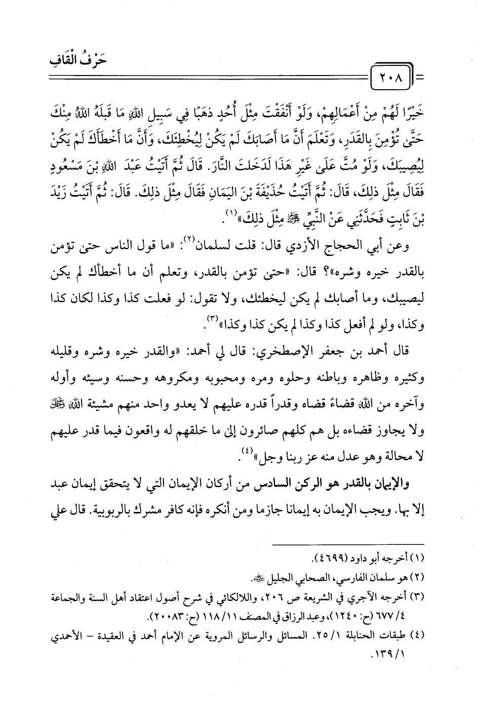 قال أحمد بن جعفر الإصطخري: قال لي أحمد: "والقدر خيره وشره وقليله وكثيره وظاهره وباطنه وحلوه ومره ومحبوبه ومكروهه وحسنه وسيئه وأوله وآخره من الله قضاءً قضاه وقدرًا قدره عليهم لا يعدو واحد منهم مشيئة الله عز وجل ولا يجاوز قضاءه بل هم كلهم صائرون إلى ما خلقهم له واقعون فيما قدر عليهم لا محالة وهو عدل منه عز ربنا وجل" (¬٤).