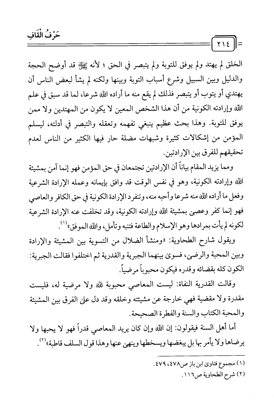 ويقول شارح الطحاوية: "ومنشأ الضلال من التسوية بين المشيئة والإرادة وبين المحبة والرضى، فسوى بينهما الجبرية والقدرية ثم اختلفوا فقالت الجبرية: الكون كله بقضائه وقدره فيكون محبوبًا مرضيًا.