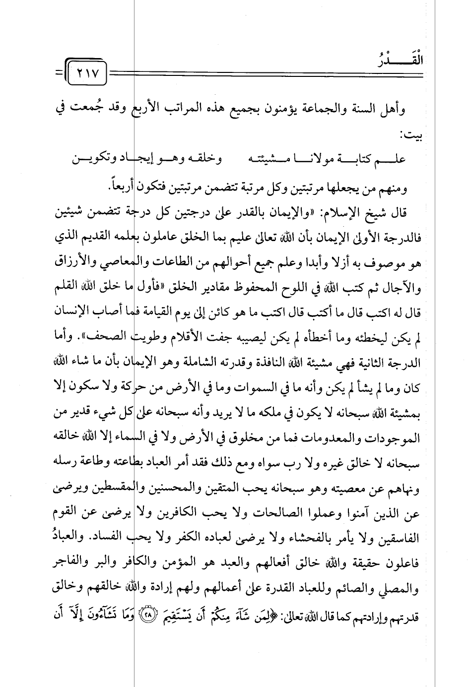 قال شيخ الإسلام: "والإيمان بالقدر على درجتين كل درجة تتضمن شيئين فالدرجة الأولى الإيمان بأن الله تعالى عليم بما الخلق عاملون بعلمه القديم الذي هو موصوف به أزلا وأبدا وعلم جميع أحوالهم من الطاعات والمعاصي والأرزاق والآجال ثم كتب الله في اللوح المحفوظ مقادير الخلق "فأول ما خلق الله القلم قال له اكتب قال ما أكتب قال اكتب ما هو كائن إلى يوم القيامة فما أصاب الإنسان لم يكن ليخطئه وما أخطأه لم يكن ليصيبه جفت الأقلام وطويت الصحف". وأما الدرجة الثانية فهي مشيئة الله النافذة وقدرته الشاملة وهو الإيمان بأن ما شاء الله كان وما لم يشأ لم يكن وأنه ما في السموات وما في الأرض من حركة ولا سكون إلا بمشيئة الله سبحانه لا يكون في ملكه ما لا يريد وأنه سبحانه على كل شيء قدير من الموجودات والمعلومات فما من مخلوق في الأرض ولا في السماء إلا الله خالقه سبحانه لا خالق غيره ولا رب سواه ومع ذلك فقد أمر العباد بطاعته وطاعة رسله ونهاهم عن معصيته وهو سبحانه يحب المتقين والمحسنين والمقسطين ويرضى عن الذين آمنوا وعملوا الصالحات ولا يحب الكافرين ولا يرضى عن القوم الفاسقين ولا يأمر بالفحشاء ولا يرضى لعباده الكفر ولا يحب الفساد والعبادُ فاعلون حقيقة والله خالق أفعالهم والعبد هو المؤمن والكافر والبر والفاجر والمصلي والصائم وللعباد القدرة على أعمالهم ولهم إرادة والله خالقهم وخالق قدرتهم وإرادتهم كما قال الله تعالى: {لِمَنْ شَاءَ مِنْكُمْ أَنْ يَسْتَقِيمَ (٢٨) وَمَا تَشَاءُونَ إِلَّا أَنْ