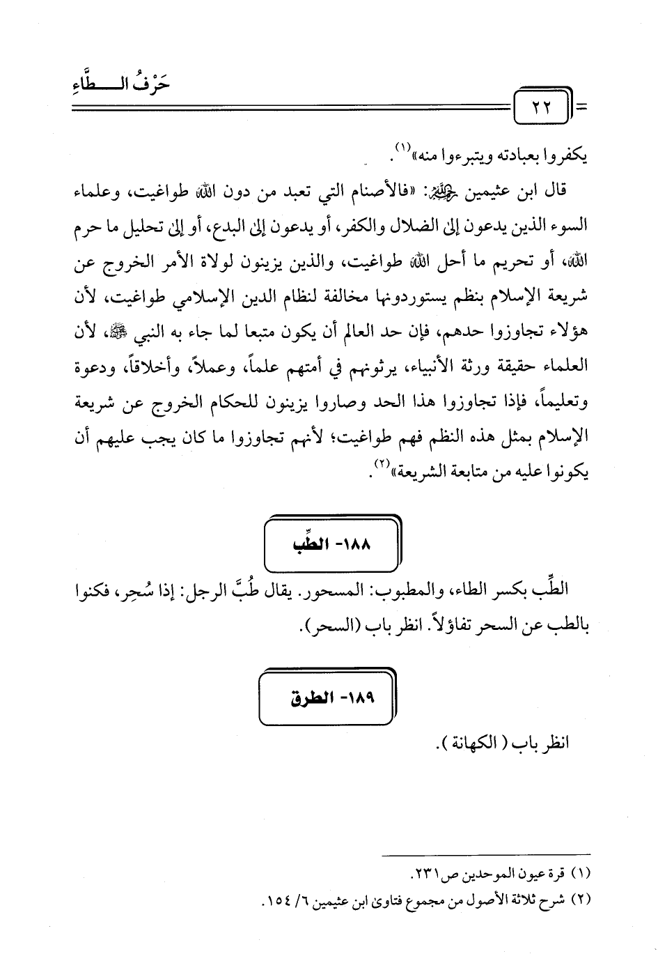 قال ابن عثيمين - رحمه الله -: "فالأصنام التي تعبد من دون الله طواغيت، وعلماء السوء الذين يدعون إلى الضلال والكفر، أو يدعون إلى البدع، أو إلى تحليل ما حرم الله، أو تحريم ما أحل الله طواغيت، والذين يزينون لولاة الأمر الخروج عن شريعة الإسلام بنظم يستوردونها مخالفة لنظام الدين الإسلامي طواغيت، لأن هؤلاء تجاوزوا حدهم، فإن حد العالم أن يكون متبعا لما جاء به النبي - صلى الله عليه وسلم -، لأن العلماء حقيقة ورثة الأنبياء، يرثونهم في أمتهم علمًا، وعملًا، وأخلاقًا، ودعوة وتعليمًا، فإذا تجاوزوا هذا الحد وصاروا يزينون للحكام الخروج عن شريعة الإسلام بمثل هذه النظم فهم طواغيت؛ لأنهم تجاوزوا ما كان يجب عليهم أن يكونوا عليه من متابعة الشريعة" (¬٢).