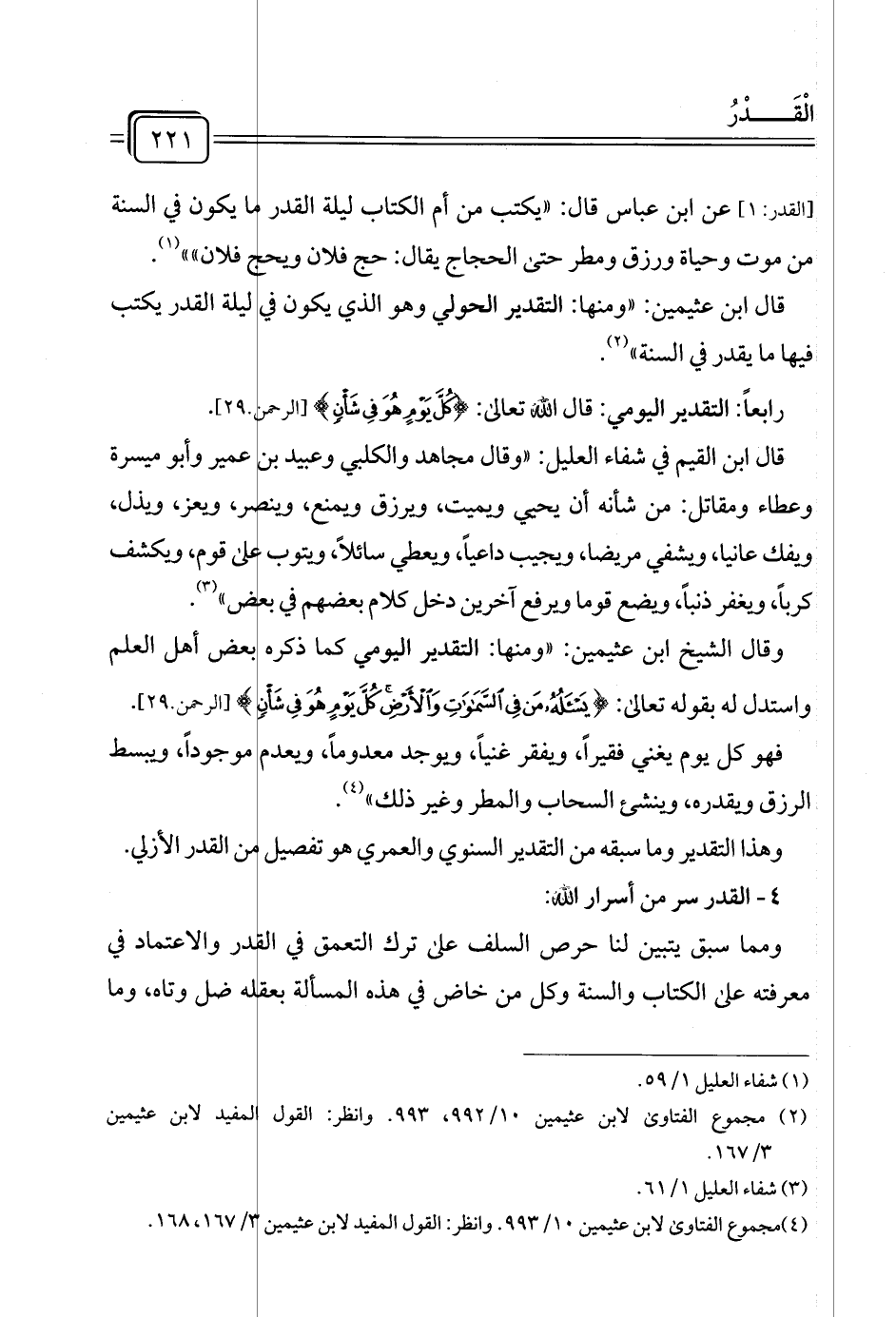 وقال الشيخ ابن عثيمين: "ومنها: التقدير اليومي كما ذكره بعض أهل العلم واستدل له بقوله تعالى: {يَسْأَلُهُ مَنْ فِي السَّمَاوَاتِ وَالْأَرْضِ كُلَّ يَوْمٍ هُوَ فِي شَأْنٍ} [الرحمن: ٢٩].