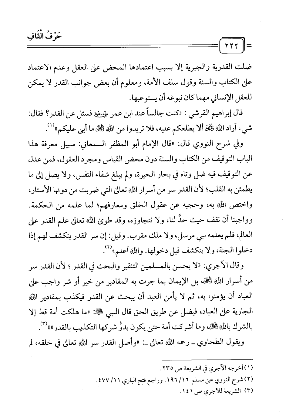 وفي شرح النووي قال: "قال الإمام أبو المظفر السمعاني: سبيل معرفة هذا الباب التوقيف من الكتاب والسنة دون محض القياس ومجرد العقول، فمن عدل عن التوقيف فيه ضل وتاه في بحار الحيرة، ولم يبلغ شفاء النفس، ولا يصل إلى ما يطمئن به القلب؛ لأن القدر سر من أسرار الله تعالى التي ضربت من دونها الأستار، واختص الله به، وحجبه عن عقول الخلق ومعارفهم؛ لما علمه من الحكمة. وواجبنا أن نقف حيث حدَّ لنا، ولا نتجاوزه، وقد طوى الله تعالى علم القدر على العالم، فلم يعلمه نبي مرسل، ولا ملك مقرب. وقيل: إن سر القدر ينكشف لهم إذا دخلوا الجنة، ولا ينكشف قبل دخولها. والله أعلم" (¬٢).