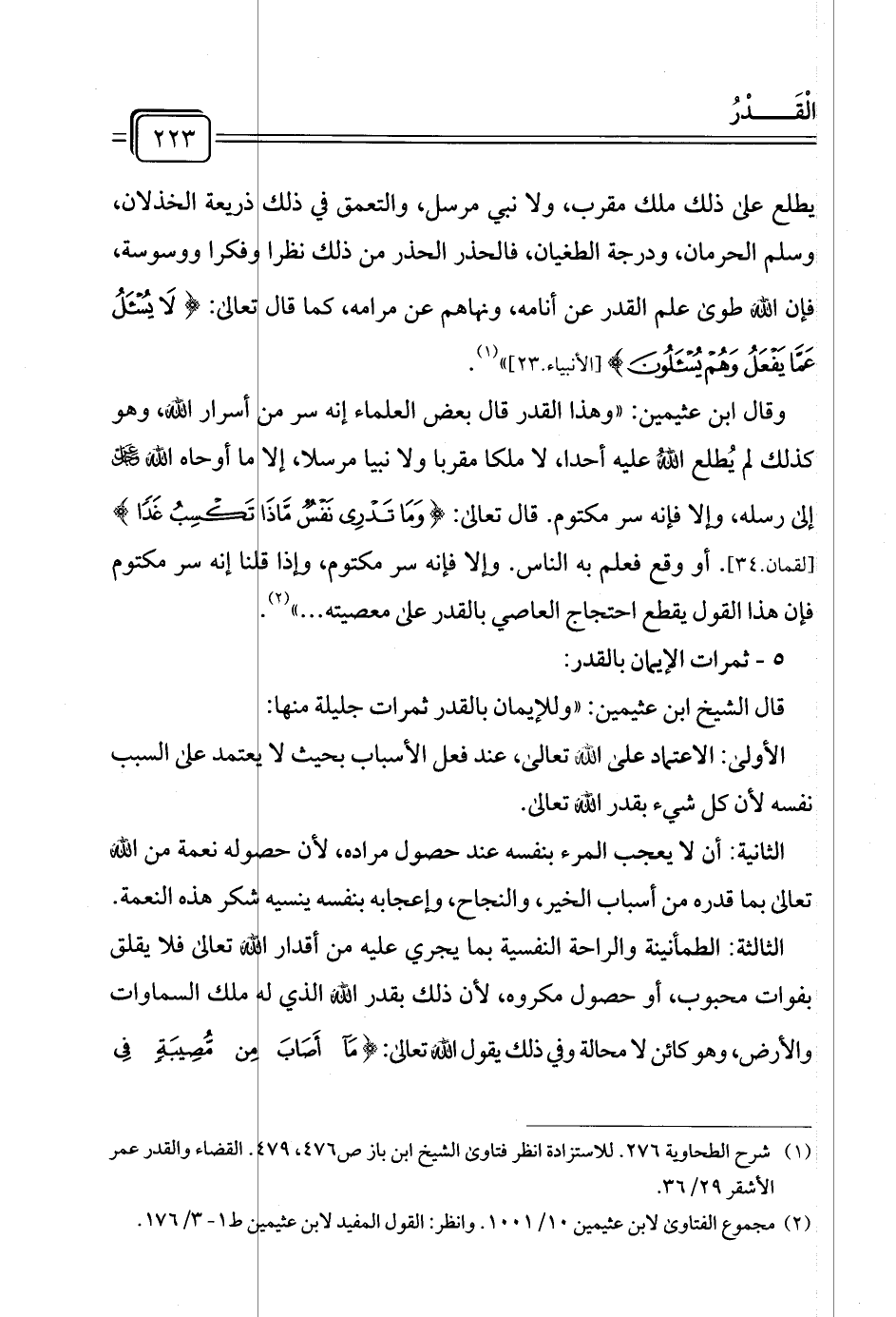 (¬١) شرح الطحاوية ٢٧٦. للاستزادة انظر فتاوى الشيخ ابن باز ص ٤٧٦، ٤٧٩. القضاء والقدر عمر الأشقر ٢٩/ ٣٦.