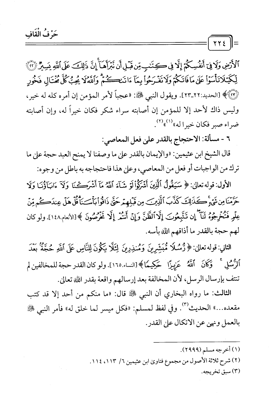 قال الشيخ ابن عثيمين: "والإيمان بالقدر على ما وصفنا لا يمنح العبد حجة على ما ترك من الواجبات أو فعل من المعاصي، وعلى هذا فاحتجاجه به باطل من وجوه: