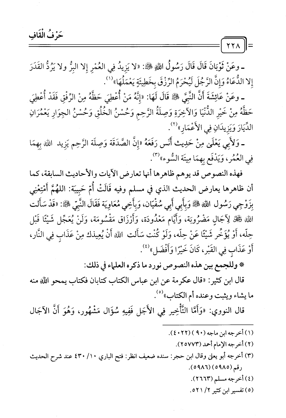 فهذه النصوص قد يوهم ظاهرها أنها تعارض الآيات والأحاديث السابقة، كما أن ظاهرها يعارض الحديث الذي في مسلم وفيه قَالَتْ أُمّ حَبِيبَة: اللهُمَّ أَمْتِعْنِي بِزَوْجِي رَسُول الله - صلى الله عليه وسلم - وَبِأَبِي أَبِي سُفْيَان، وَبِأَخِي مُعَاوِية فَقَالَ النَّبِيّ - صلى الله عليه وسلم -: "قَدْ سَأَلت الله عز وجل لِآجَالٍ مَضْرُوبَة، وَأَيَّام مَعْدُودَة، وَأَرْزَاق مَقْسُومَة، وَلَنْ يُعَجِّل شَيْئًا قَبْل حِلّه، أَوْ يُؤَخِّر شَيْئًا عَنْ حِلّه، وَلَوْ كُنْت سَأَلت الله أَنْ يُعِيذك مِنْ عَذَاب فِي النَّار، أَوْ عَذَابٍ فِي القَبْر، كَانَ خَيْرًا وَأَفْضَل" (¬٤).
