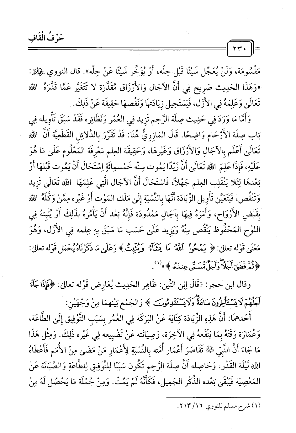 وَأَمَّا مَا وَرَدَ فِي حَدِيث صِلَة الرَّحِم تَزِيد فِي العُمْر وَنَظَائِره فَقَدْ سَبَقَ تَأْوِيله فِي بَاب صِلَة الأَرْحَام وَاضِحًا. قَالَ المَازِرِيُّ هُنَا: قَدْ تَقَرَّرَ بِالدَّلائِلِ القَطْعِيَّة أَنَّ الله تَعَالَى أَعْلَم بِالآجَالِ وَالأَرْزَاق وَغَيْرهَا، وَحَقِيقَة العِلم مَعْرِفَة المَعْلُوم عَلَى مَا هُوَ عَلَيْهِ، فَإِذَا عَلِمَ الله تَعَالَى أَنَّ زَيْدًا يَمُوت سِنّه خَمْسمِائَةٍ اسْتَحَالَ أَنْ يَمُوت قَبْلهَا أَوْ بَعْدهَا لِئَلا يَنْقَلِب العِلم جَهْلًا، فَاسْتَحَالَ أَنَّ الآجَال الَّتِي عَلِمَهَا الله تَعَالَى تَزِيد وَتَنْقُص، فَيَتَعَيَّن تَأْوِيل الزِّيَادَة أَنهَا بِالنِّسْبَةِ إِلَى مَلَك المَوْت أَوْ غَيْره مِمَّنْ وَكَّلَهُ الله بِقَبْضِ الأَرْوَاح، وَأَمَرَهُ فِيهَا بِآجَالٍ مَمْدُودَة فَإِنَّهُ بَعْد أَنْ يَأْمُرهُ بذَلِكَ أَوْ يُثْبِتهُ فِي اللوْح المَحْفُوظ يَنْقُص مِنْهُ وَيزِيد عَلَى حَسَب مَا سَبَقَ بِهِ عِلمه فِي الأَزَل، وَهُوَ مَعْنَى قَوْله تعالى: {يَمْحُو اللَّهُ مَا يَشَاءُ وَيُثْبِتُ} وَعَلَى مَا ذَكَرْنَاهُ يُحْمَل قَوْله تعالى: {ثُمَّ قَضَى أَجَلًا وَأَجَلٌ مُسَمًّى عِنْدَهُ} " (¬١).