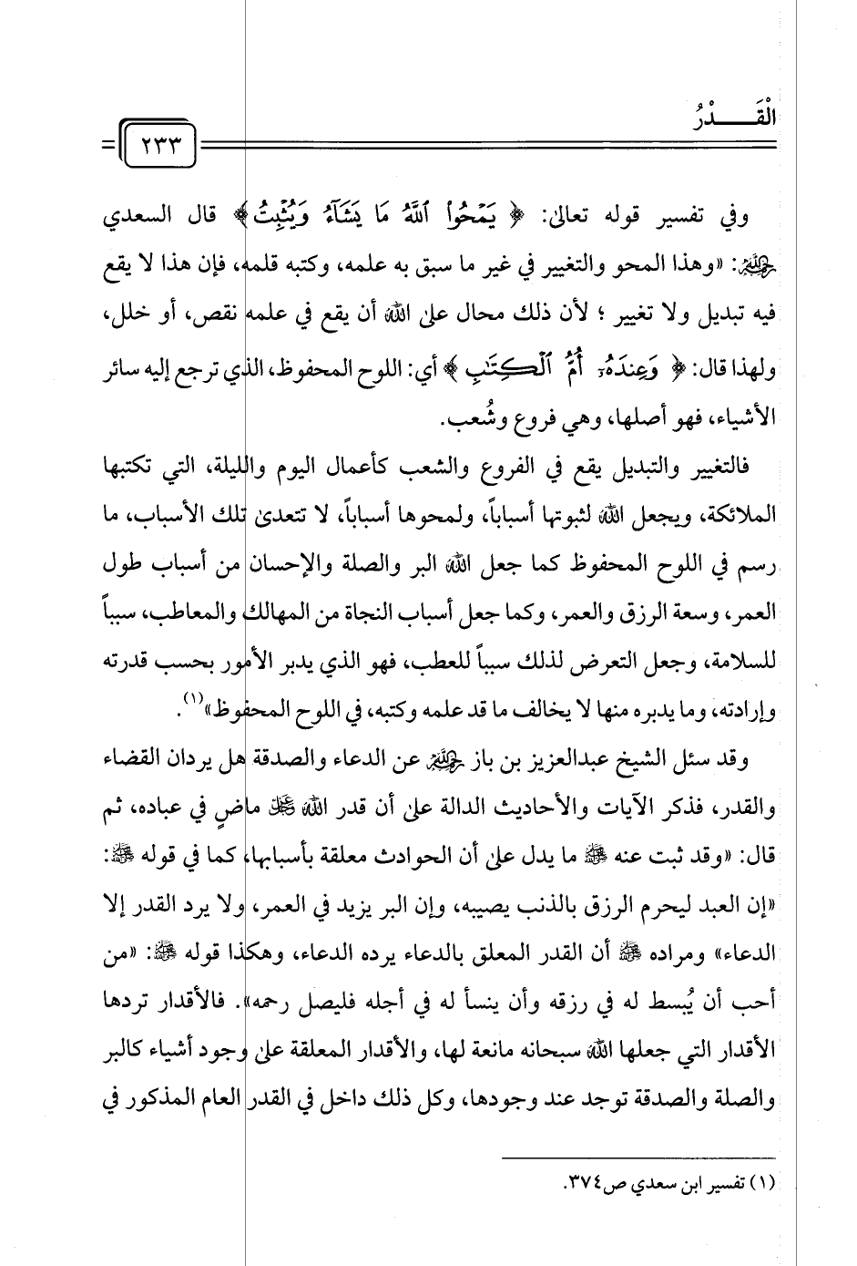 وفي تفسير قوله تعالى: {يَمْحُو اللَّهُ مَا يَشَاءُ وَيُثْبِتُ} قال السعدي رَحِمَهُ اللهُ: "وهذا المحو والتغيير في غير ما سبق به علمه، وكتبه قلمه، فإن هذا لا يقع فيه تبديل ولا تغيير؛ لأن ذلك محال على الله أن يقع في علمه نقص، أو خلل، ولهذا قال: {وَعِنْدَهُ أُمُّ الْكِتَابِ} أي: اللوح المحفوظ، الذي ترجع إليه سائر الأشياء، فهو أصلها، وهي فروع وشُعب.