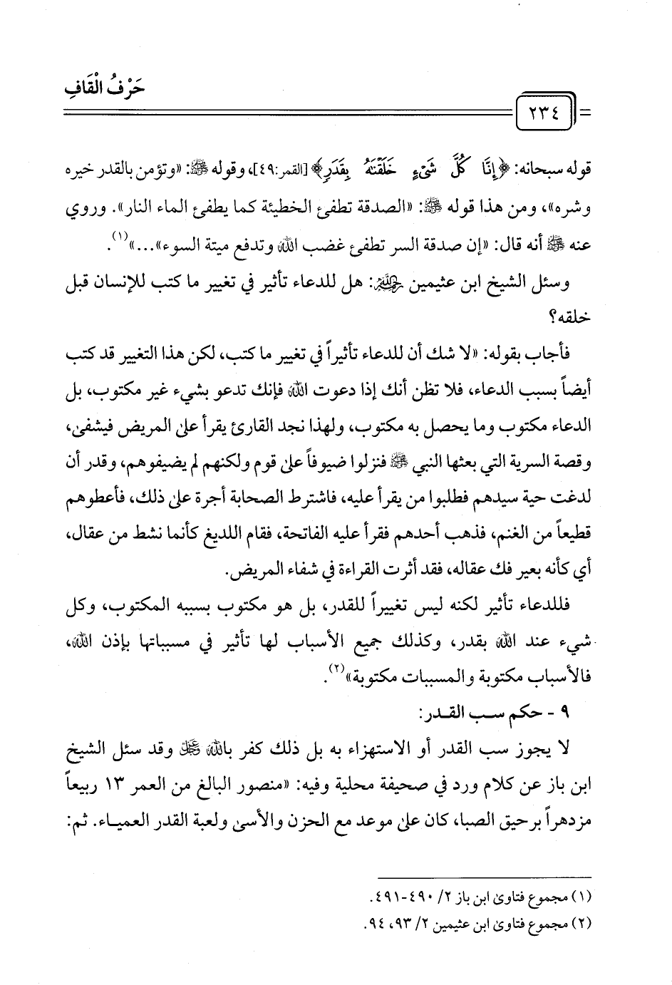قوله سبحانه: {إِنَّا كُلَّ شَيْءٍ خَلَقْنَاهُ بِقَدَرٍ} [القمر: ٤٩]، وقوله - صلى الله عليه وسلم -: "وتؤمن بالقدر خيره وشره"، ومن هذا قوله - صلى الله عليه وسلم -: "الصدقة تطفئ الخطيئة كما يطفئ الماء النار". وروي عنه - صلى الله عليه وسلم - أنه قال: "إن صدقة السر تطفئ غضب الله وتدفع ميتة السوء" ... " (¬١).