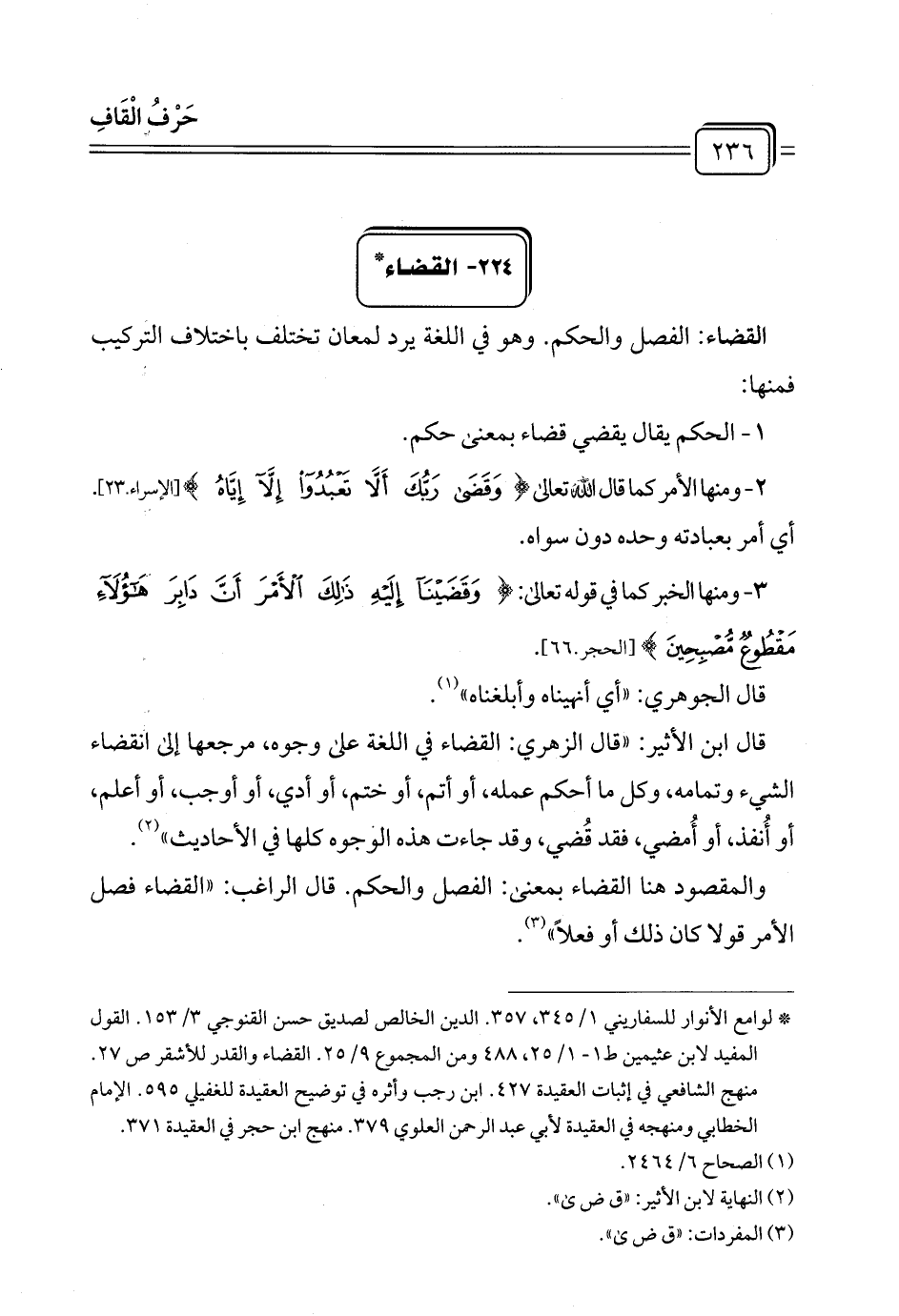 والمقصود هنا القضاء بمعنى: الفصل والحكم. قال الراغب: "القضاء فصل الأمر قولا كان ذلك أو فعلًا" (¬٣).