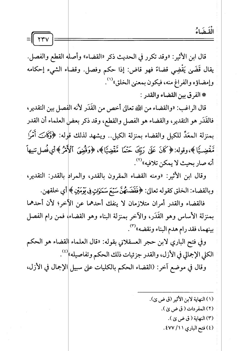 وفي فتح الباري لابن حجر العسقلاني بقوله: "قال العلماء القضاء هو الحكم الكلي الإجمالي في الأزل، والقدر جزئيات ذلك الحكم وتفاصيله" (¬٤).