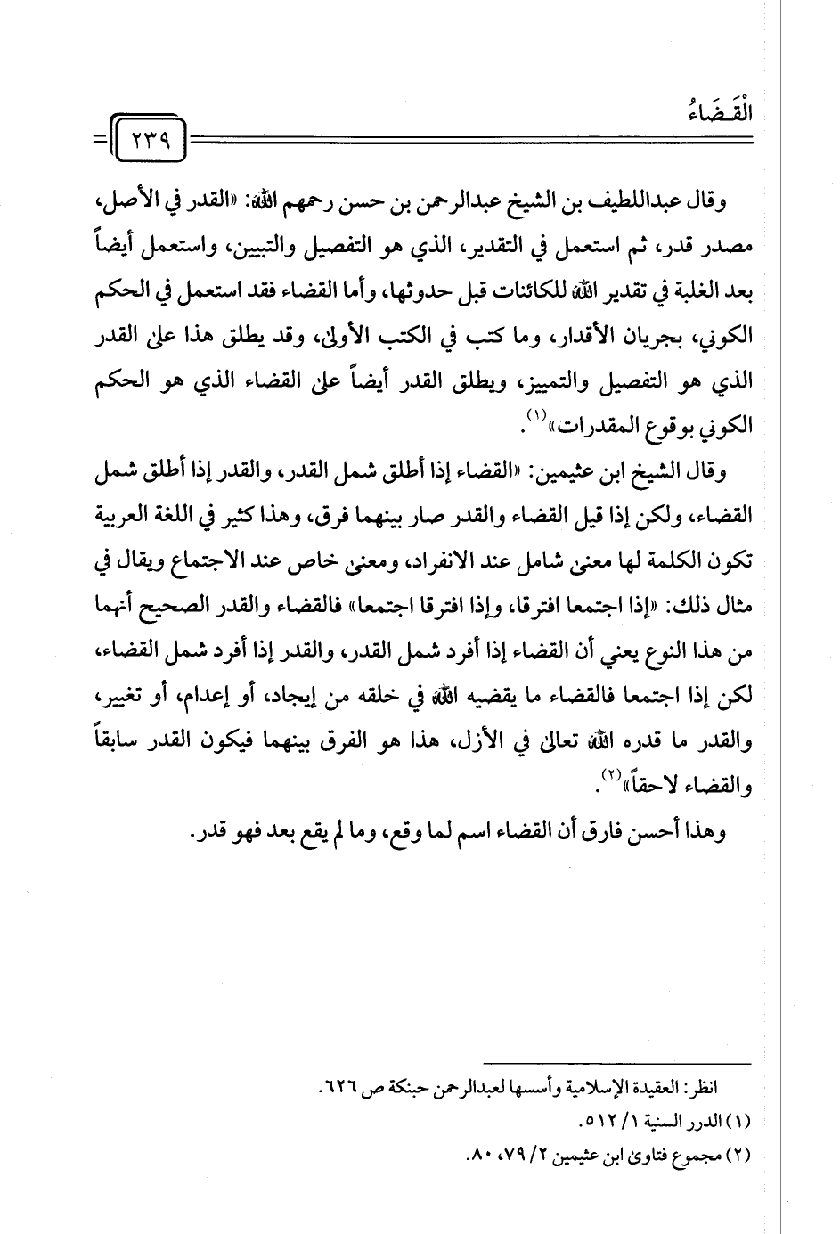 وقال عبد اللطيف بن الشيخ عبد الرحمن بن حسن رحمهم الله: "القدر في الأصل، مصدر قدر، ثم استعمل في التقدير، الذي هو التفصيل والتبيين، واستعمل أيضًا بعد الغلبة في تقدير الله للكائنات قبل حدوثها، وأما القضاء فقد استعمل في الحكم الكوني، بجريان الأقدار، وما كتب في الكتب الأولى، وقد يطلق هذا على القدر الذي هو التفصيل والتمييز، ويطلق القدر أيضًا على القضاء الذي هو الحكم الكوني بوقوع المقدرات" (¬١).