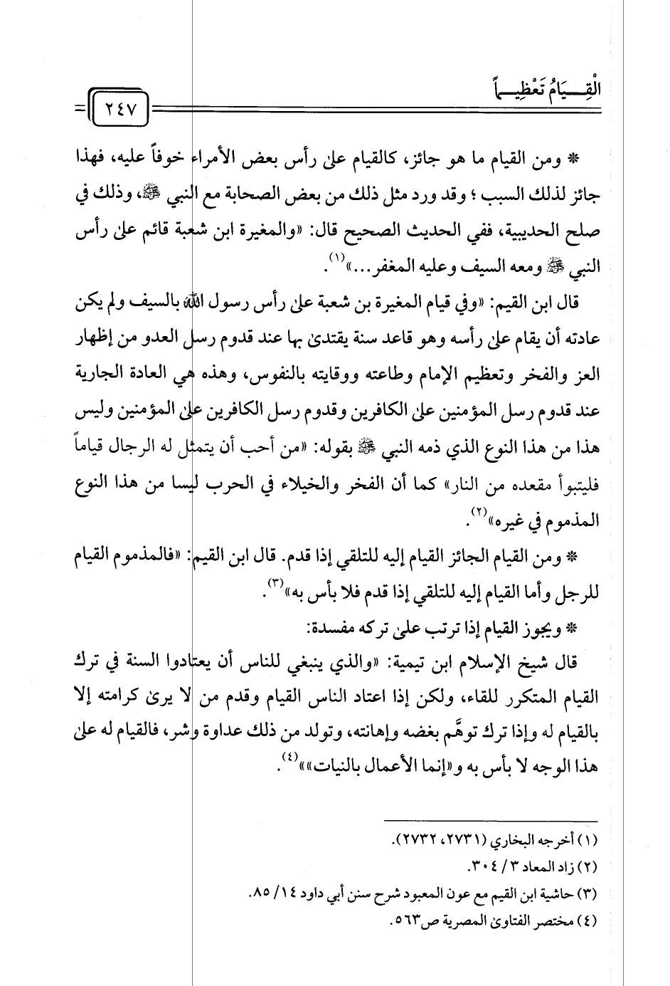 قال شيخ الإسلام ابن تيمية: "والذي ينبغي للناس أن يعتادوا السنة في ترك القيام المتكرر للقاء، ولكن إذا اعتاد الناس القيام وقدم من لا يرى كرامته إلا بالقيام له وإذا ترك توهَّم بغضه وإهانته، وتولد من ذلك عداوة وشر، فالقيام له على هذا الوجه لا بأس به و"إنما الأعمال بالنيات"" (¬٤).