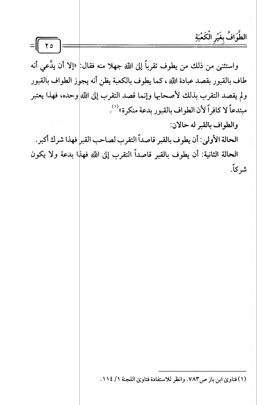 واستثنى من ذلك من يطوف تقربًا إلى الله جهلا منه فقال: "إلا أن يدَّعي أنه طاف بالقبور بقصد عبادة الله، كما يطوف بالكعبة يظن أنه يجوز الطواف بالقبور ولم يقصد التقرب بذلك لأصحابها وإنما قصد التقرب إلى الله وحده، فهذا يعتبر مبتدعًا لا كافرًا لأن الطواف بالقبور بدعة منكرة" (¬١).
