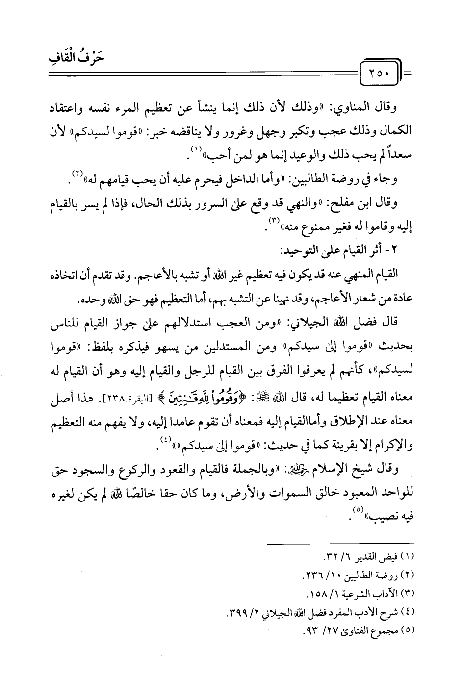 وقال المناوي: "وذلك لأن ذلك إنما ينشأ عن تعظيم المرء نفسه واعتقاد الكمال وذلك عجب وتكبر وجهل وغرور ولا يناقضه خبر: "قوموا لسيدكم" لأن سعدًا لم يحب ذلك والوعيد إنما هو لمن أحب" (¬١).