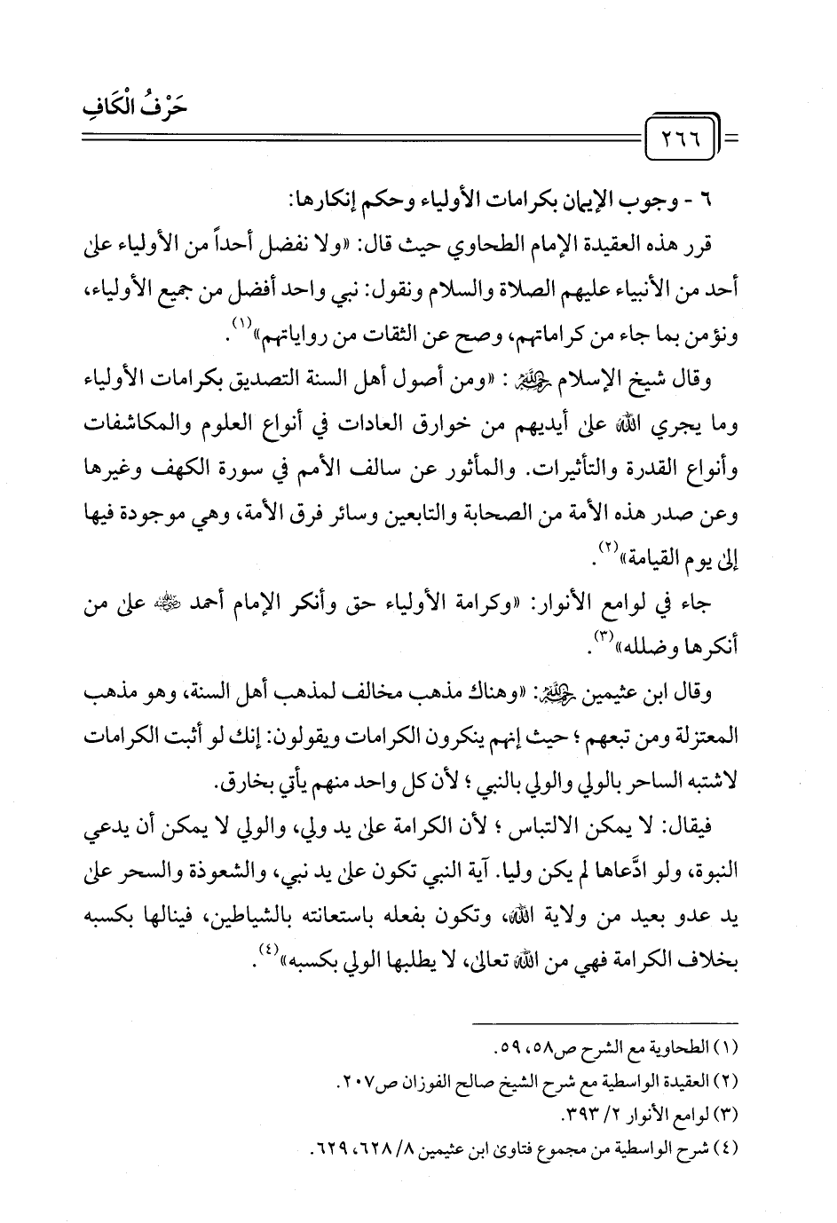 وقال شيخ الإسلام رَحِمَهُ اللهُ: "ومن أصول أهل السنة التصديق بكرامات الأولياء وما يجري الله على أيديهم من خوارق العادات في أنواع العلوم والمكاشفات وأنواع القدرة والتأثيرات. والمأثور عن سالف الأمم في سورة الكهف وغيرها وعن صدر هذه الأمة من الصحابة والتابعين وسائر فرق الأمة، وهي موجودة فيها إلى يوم القيامة" (¬٢).
