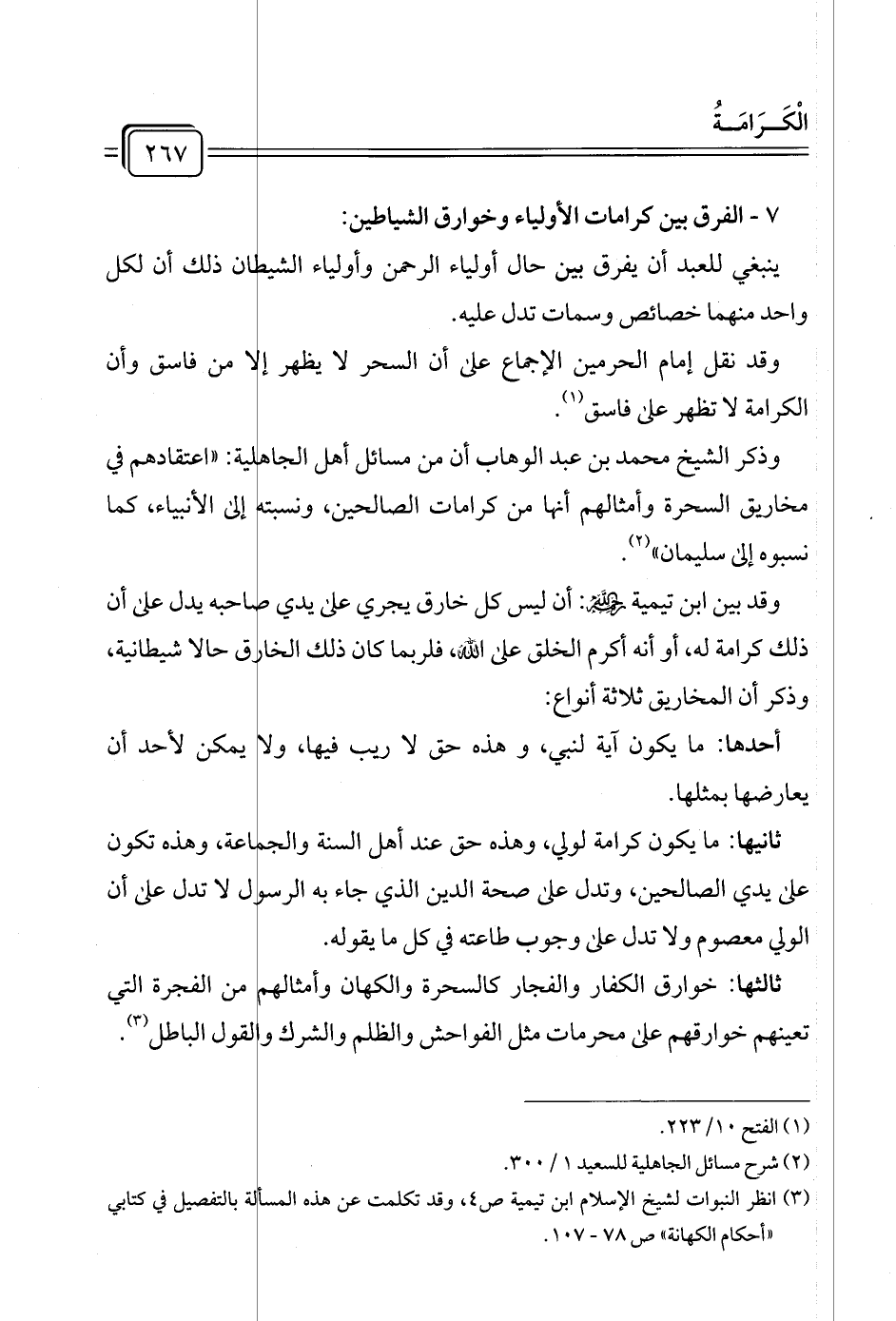 وذكر الشيخ محمد بن عبد الوهاب أن من مسائل أهل الجاهلية: "اعتقادهم في مخاريق السحرة وأمثالهم أنها من كرامات الصالحين، ونسبته إلى الأنبياء، كما نسبوه إلى سليمان" (¬٢).
