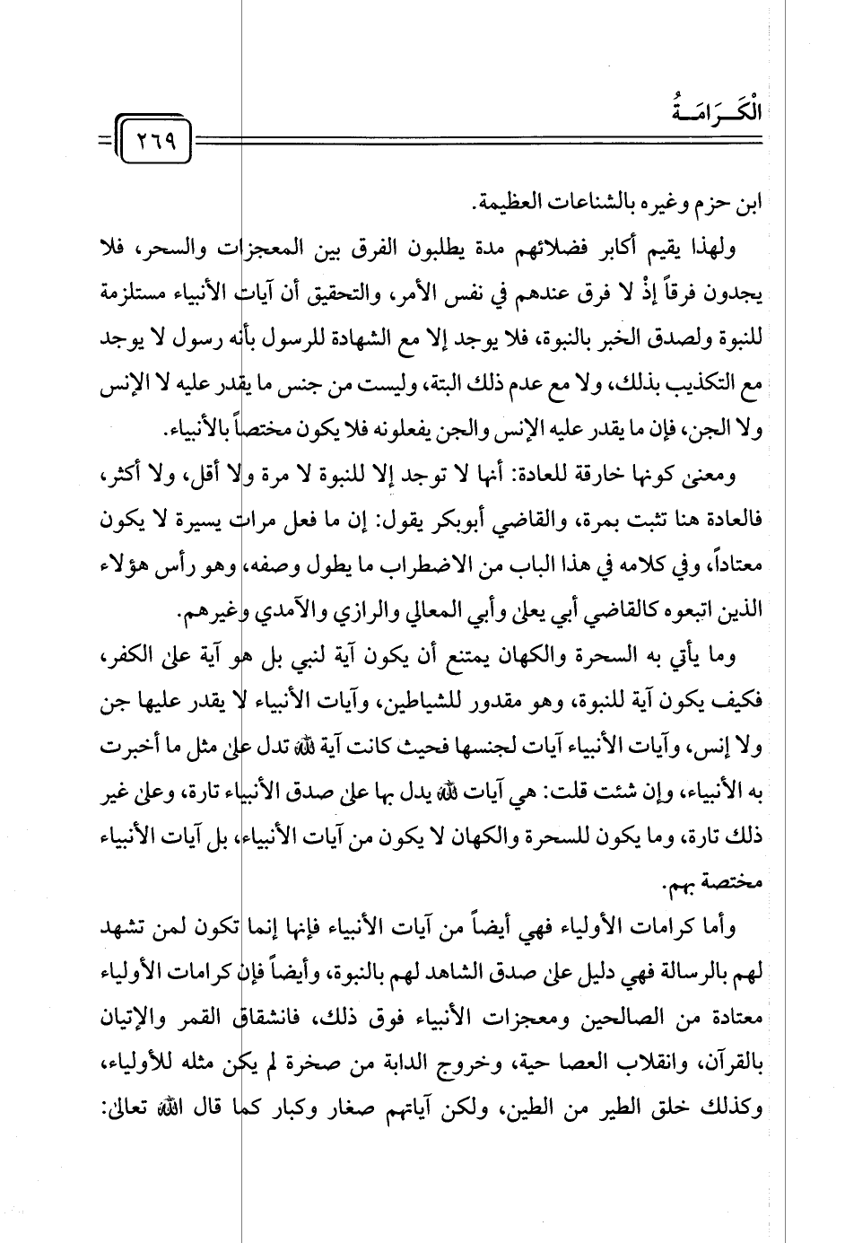 وأما كرامات الأولياء فهي أيضًا من آيات الأنبياء فإنها إنما تكون لمن تشهد لهم بالرسالة فهي دليل على صدق الشاهد لهم بالنبوة، وأيضًا فإن كرامات الأولياء معتادة من الصالحين ومعجزات الأنبياء فوق ذلك، فانشقاق القمر والإتيان بالقرآن، وانقلاب العصا حية، وخروج الدابة من صخرة لم يكن مثله للأولياء، وكذلك خلق الطير من الطين، ولكن آياتهم صغار وكبار قال الله تعالى: