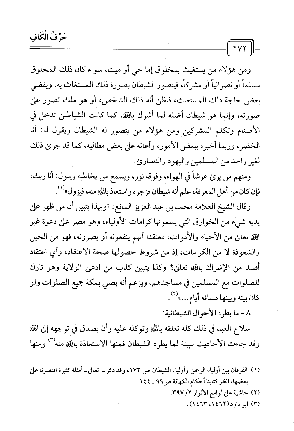 (¬١) الفرقان بين أولياء الرحمن وأولياء الشيطان ص ١٧٣، وقد ذكر - تعالى - أمثلة كثيرة اقتصرنا على بعضها، انظر كتابنا أحكام الكهانة ص ٩٩ - ١٤٤.