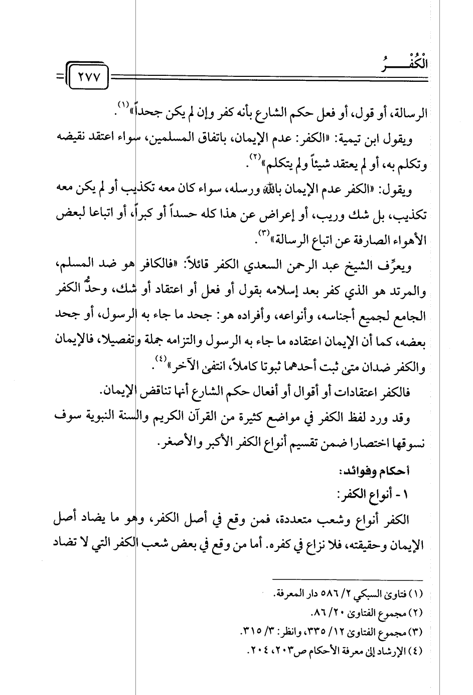 ويعرِّف الشيخ عبد الرحمن السعدي الكفر قائلًا: "فالكافر هو ضد المسلم، والمرتد هو الذي كفر بعد إسلامه بقول أو فعل أو اعتقاد أو شك، وحد الكفر الجامع لجميع أجناسه، وأنواعه، وأفراده هو: جحد ما جاء به الرسول، أو جحد بعضه، كما أن الإيمان اعتقاده ما جاء به الرسول والتزامه جملة تفصيلا، فالإيمان والكفر ضدان متى ثبت أحدهما ثبوتا كاملا، انتفى الآخر" (¬٤).