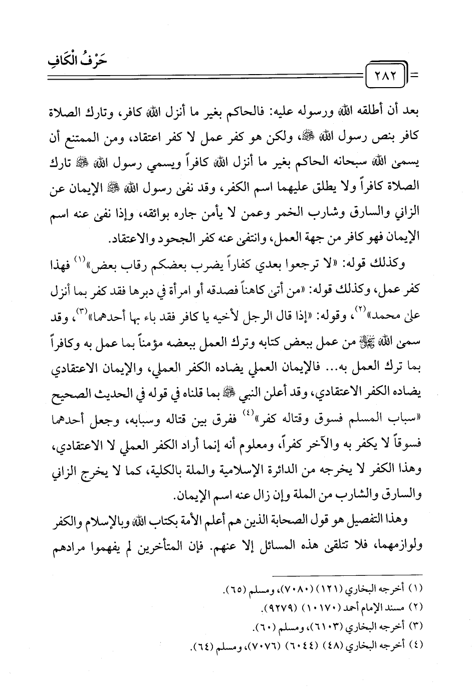 وكذلك قوله: "لا ترجعوا بعدي كفارًا يضرب بعضكم رقاب بعض" (¬١) فهذا كفر عمل، وكذلك قوله: "من أتى كاهنًا فصدقه أو امرأة في دبرها فقد كفر بما أنزل على محمد" (¬٢)، وقوله: "إذا قال الرجل لأخيه يا كافر فقد باء بها أحدهما" (¬٣)، وقد سمى الله سُبْحانه وتعالى من عمل ببعض كتابه وترك العمل ببعضه مؤمنًا بما عمل به وكافرًا بما ترك العمل به ... فالإيمان العملي يضاده الكفر العملي، والإيمان الاعتقادي يضاده الكفر الاعتقادي، وقد أعلن النبي - صلى الله عليه وسلم - بما قلناه في قوله في الحديث الصحيح "سباب المسلم فسوق وقتاله كفر" (¬٤) ففرق بين قتاله وسبابه، وجعل أحدهما فسوقًا لا يكفر به والآخر كفرًا، ومعلوم أنه إنما أراد الكفر العملي لا الاعتقادي، وهذا الكفر لا يخرجه من الدائرة الإسلامية والملة بالكلية، كما لا يخرج الزاني والسارق والشارب من الملة وإن زال عنه اسم الإيمان.