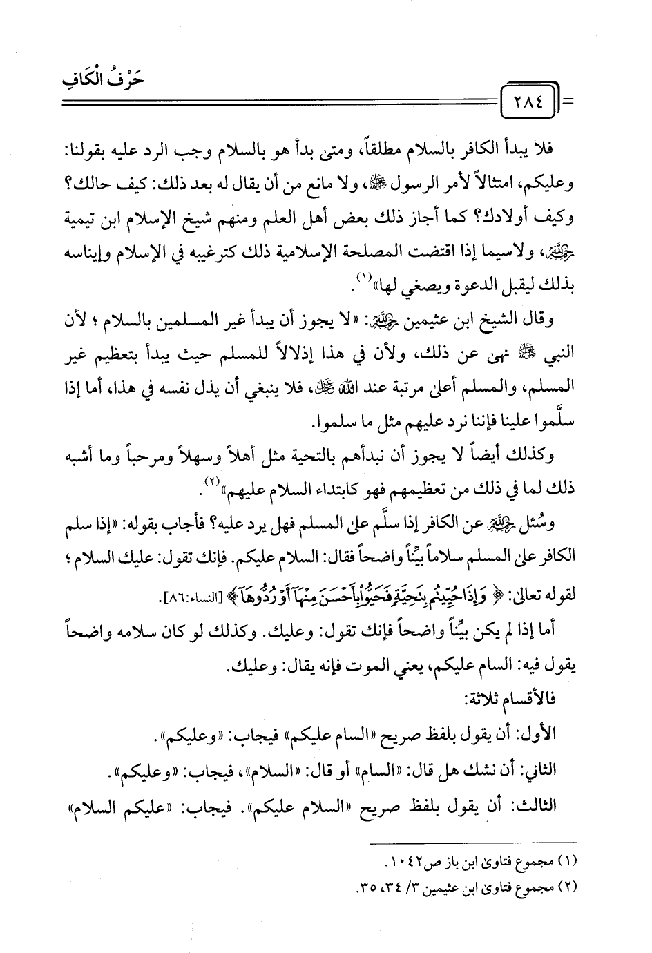 وقال الشيخ ابن عثيمين رَحِمه الله: "لا يجوز أن يبدأ غير المسلمين بالسلام؛ لأن النبي - صلى الله عليه وسلم - نهى عن ذلك، ولأن في هذا إذلالًا للمسلم حيث يبدأ بتعظيم غير المسلم، والمسلم أعلى مرتبة عند الله عزَّ وجلَّ، فلا ينبغي أن يذل نفسه في هذا، أما إذا سلَّموا علينا فإننا نرد عليهم مثل ما سلموا.