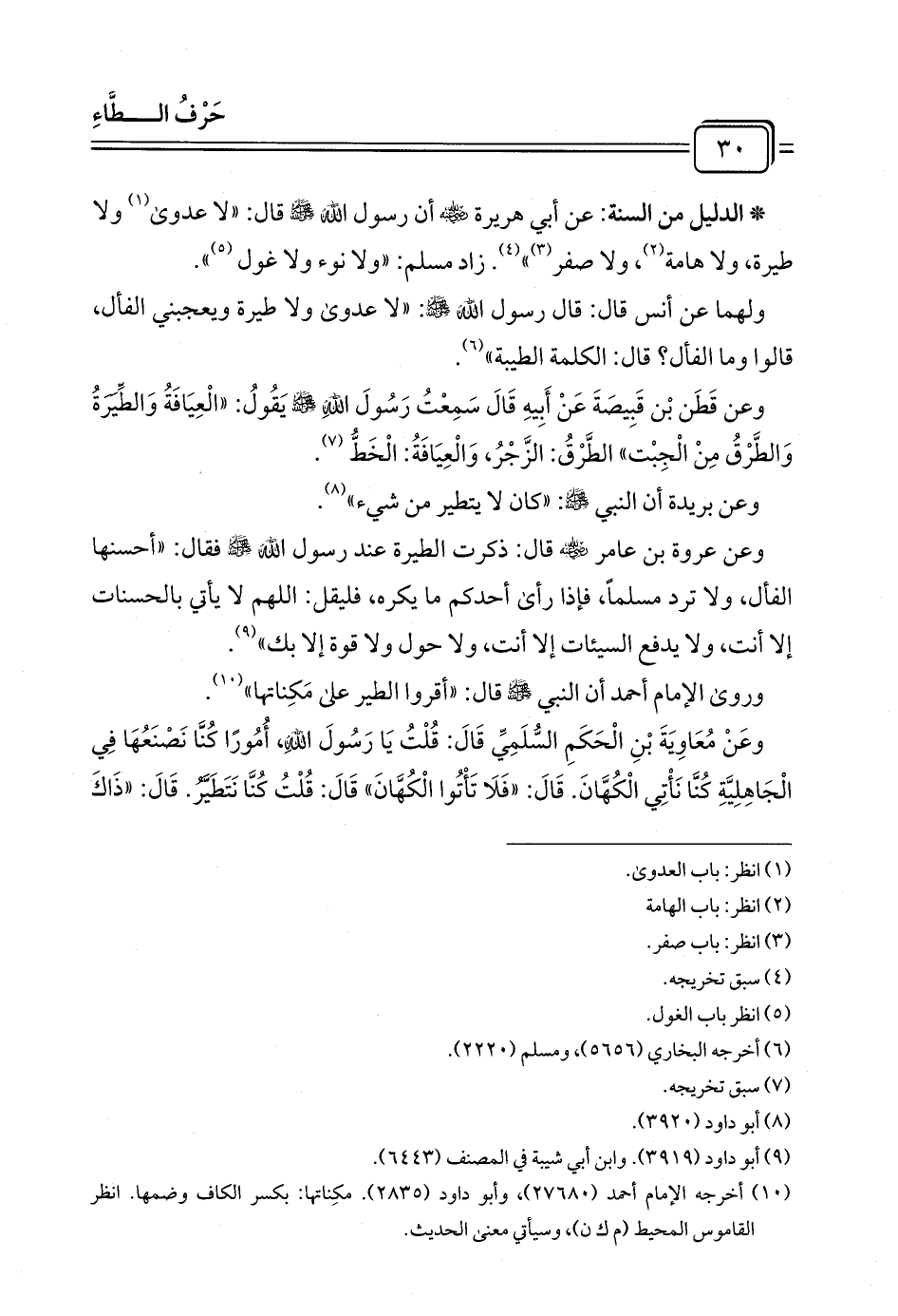 * في الدليل من السنة: عن أبي هريرة - رضي الله عنه - أن رسول الله - صلى الله عليه وسلم - قال: "لا عدوى (¬١) ولا طيرة، ولا هامة (¬٢)، ولا صفر (¬٣) " (¬٤). زاد مسلم: "ولا نوء ولا غول (¬٥) ".
