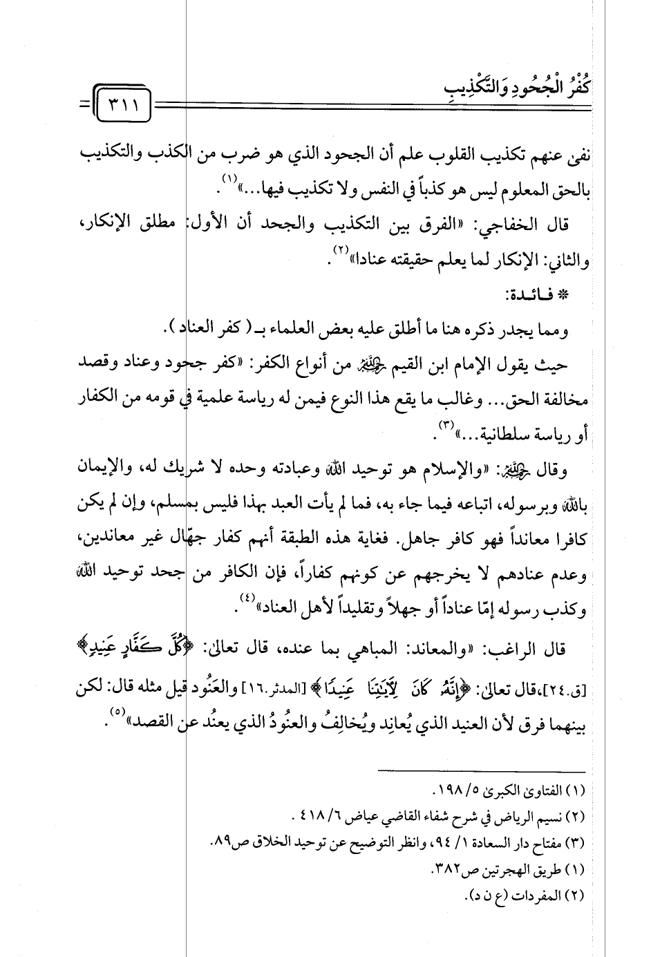 حيث يقول الإمام ابن القيم رَحِمَه الله من أنواع الكفر: "كفر جحود وعناد وقصد مخالفة الحق ... وغالب ما يقع هذا النوع فيمن له رياسة علمية في قومه من الكفار أو رياسة سلطانية ... " (¬٣).