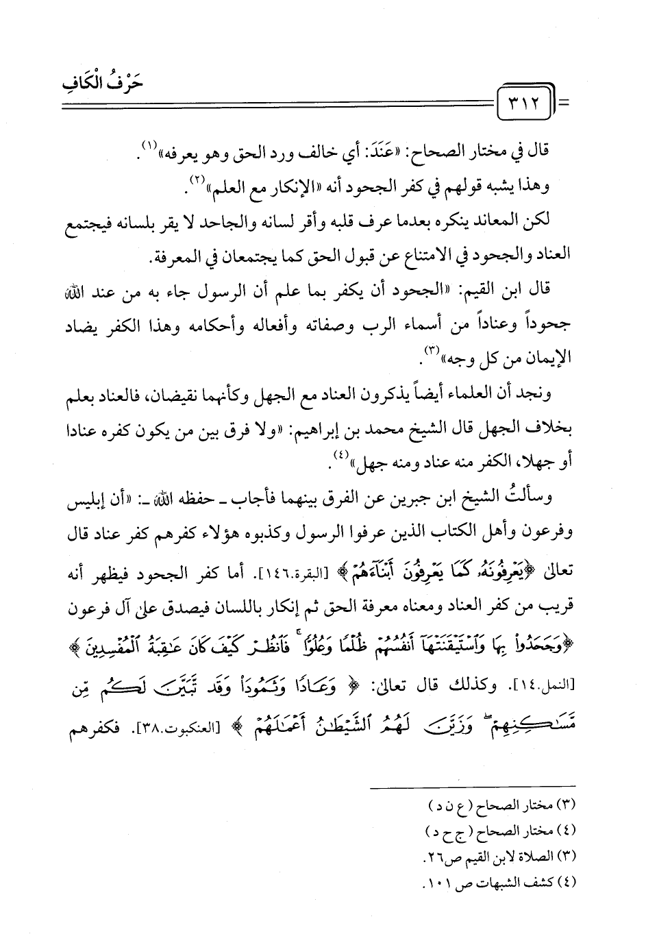 وسألتُ الشيخ ابن جبرين عن الفرق بينهما فأجاب - حفظه الله -: "أن إبليس وفرعون وأهل الكتاب الذين عرفوا الرسول وكذبوه هؤلاء كفرهم كفر عناد قال تعالى {يَعْرِفُونَهُ كَمَا يَعْرِفُونَ أَبْنَاءَهُمُ} [البقرة.١٤٦]. أما كفر الجحود فيظهر أنه قريب من كفر العناد ومعناه معرفة الحق ثم إنكار باللسان فيصدق على آل فرعون {وَجَحَدُوا بِهَا وَاسْتَيْقَنَتْهَا أَنْفُسُهُمْ ظُلْمًا وَعُلُوًّا فَانْظُرْ كَيْفَ كَانَ عَاقِبَةُ الْمُفْسِدِينَ} [النمل.١٤]. وكذلك قال تعالى: {وَعَادًا وَثَمُودَ وَقَدْ تَبَيَّنَ لَكُمْ مِنْ مَسَاكِنِهِمْ وَزَيَّنَ لَهُمُ الشَّيْطَانُ أَعْمَالَهُمْ} [العنكبوت ٣٨٠]. فكفرهم