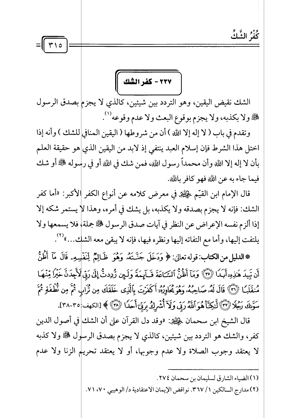 قال الشيخ ابن سحمان رَحِمَه الله: "وقد دل القرآن على أن الشك في أصول الدين كفر، والشك هو التردد بين شيئين، كالذي لا يجزم بصدق الرسول - صلى الله عليه وسلم - ولا كذبه لا يعتقد وجوب الصلاة ولا عدم وجوبها، أو لا يعتقد تحريم الزنا ولا عدم