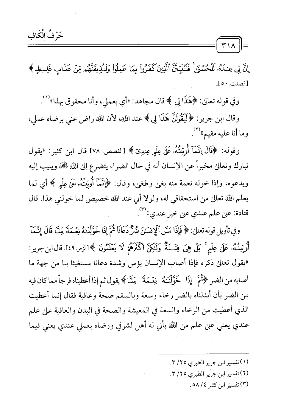 وقوله: {قَالَ إِنَّمَا أُوتِيتُهُ عَلَى عِلْمٍ عِنْدِي} [القصص: ٧٨] قال ابن كثير: "يقول تبارك وتعالى مخبرًا عن الإنسان أنه في حال الضراء يتضرع إلى الله وينيب إليه ويدعوه، وإذا خوله نعمة منه بغى وطغى، وقال: {إِنَّمَا أُوتِيتُهُ عَلَى عِلْمٍ} أي لما يعلم الله تعالى من استحقاقي له، ولولا أني عند الله خصيص لما خولني هذا. قال قتادة: على علم عندي على خير عندي" (¬٣).