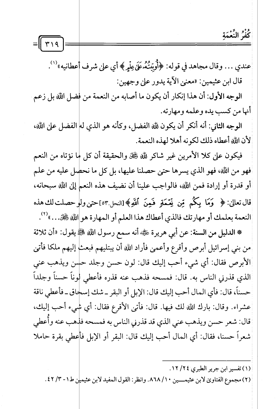 فيكون على كلا الأمرين غير شاكر لله عزَّ وجلَّ والحقيقة أن كل ما نؤتاه من النعم فهو من الله، فهو الذي يسرها حتى حصلنا عليها، بل كل ما نحصل عليه من علم أو قدرة أو إرادة فمن الله، فالواجب علينا أن نضيف هذه النعم إلى الله سبحانه، قال تعالى: {وَمَا بِكُمْ مِنْ نِعْمَةٍ فَمِنَ اللَّهِ} [النحل ٥٣٠] حتى ولو حصلت لك هذه النعمة بعلمك أو مهارتك فالذي أعطاك هذا العلم أو المهارة هو الله عزَّ وجلَّ ... " (¬٢).