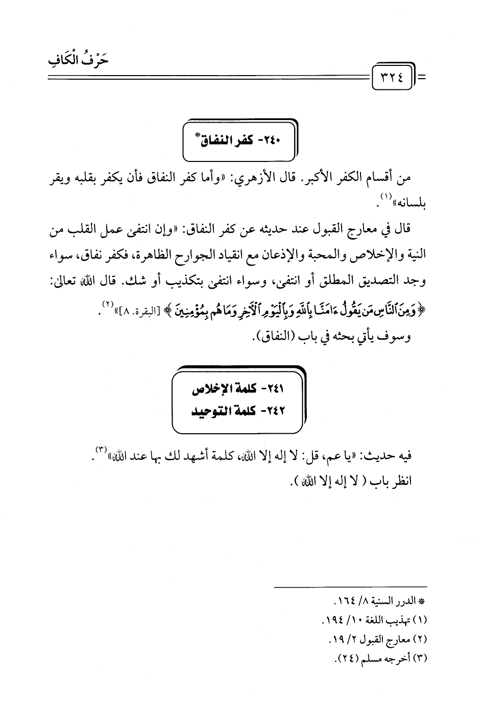 قال في معارج القبول عند حديثه عن كفر النفاق: "وإن انتفى عمل القلب من النية والإخلاص والمحبة والإذعان مع انقياد الجوارح الظاهرة، فكفر نفاق، سواء وجد التصديق المطلق أو انتفى، وسواء انتفى بتكذيب أو شك. قال الله تعالى: {وَمِنَ النَّاسِ مَنْ يَقُولُ آمَنَّا بِاللَّهِ وَبِالْيَوْمِ الْآخِرِ وَمَا هُمْ بِمُؤْمِنِينَ} [البقرة.٨٠] " (¬٢).