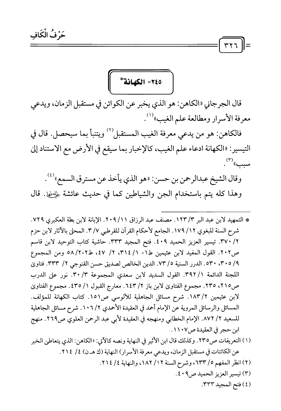 (¬١) التعريفات ص ٢٣٥. وكذلك قال ابن الأثير في النهاية ونصه كالآتي: "الكاهن: الذي يتعاطى الخبر عن الكائنات في مستقبل الزمان، ويدعي معرفة الأسرار) النهاية (ك هـ ن) ٤/ ٢١٤.