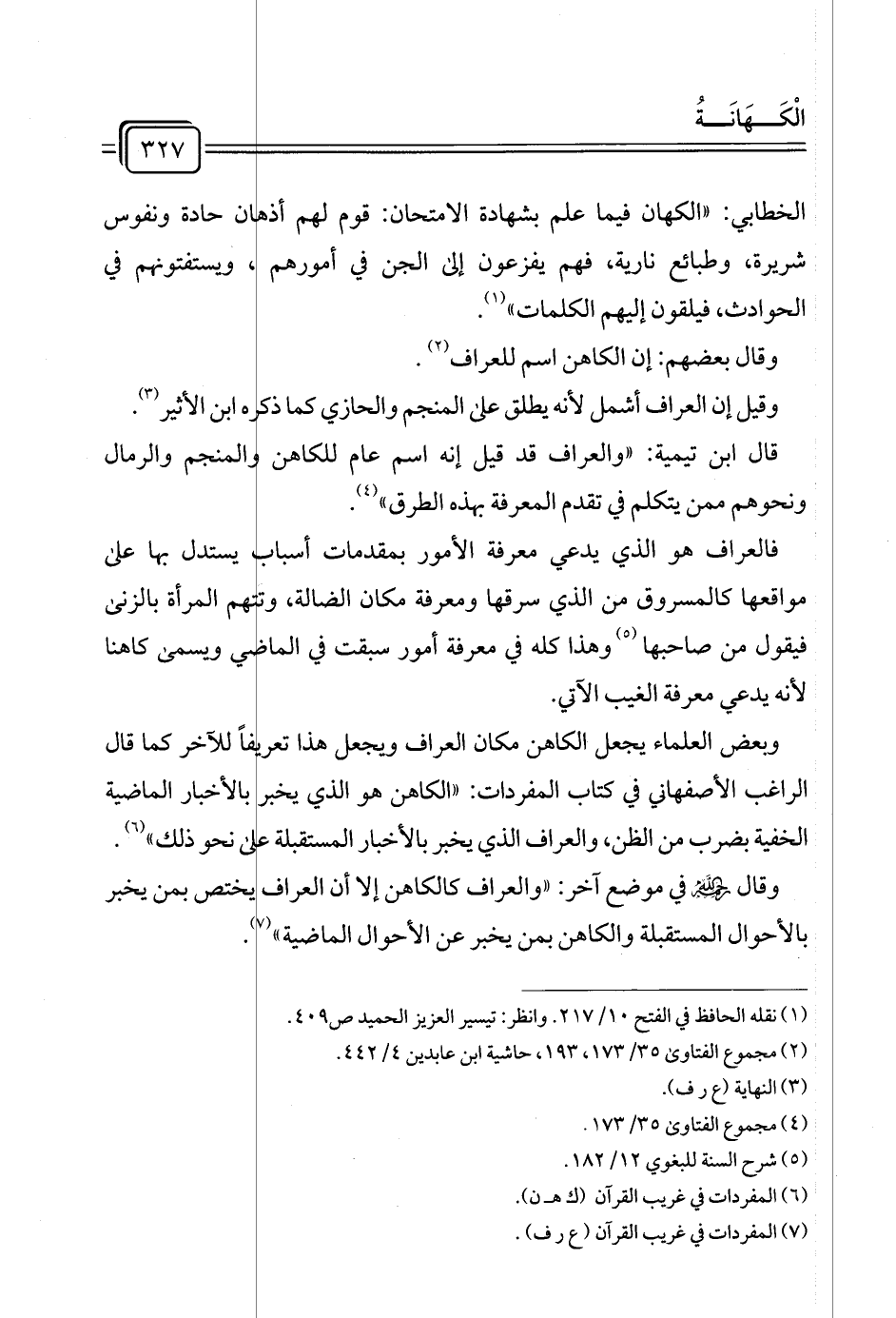 وقال رَحِمَه الله في موضع آخر: "والعراف كالكاهن إلا أن العراف يختص بمن يخبر بالأحوال المستقبلة والكاهن بمن يخبر عن الأحوال الماضية" (¬٧)