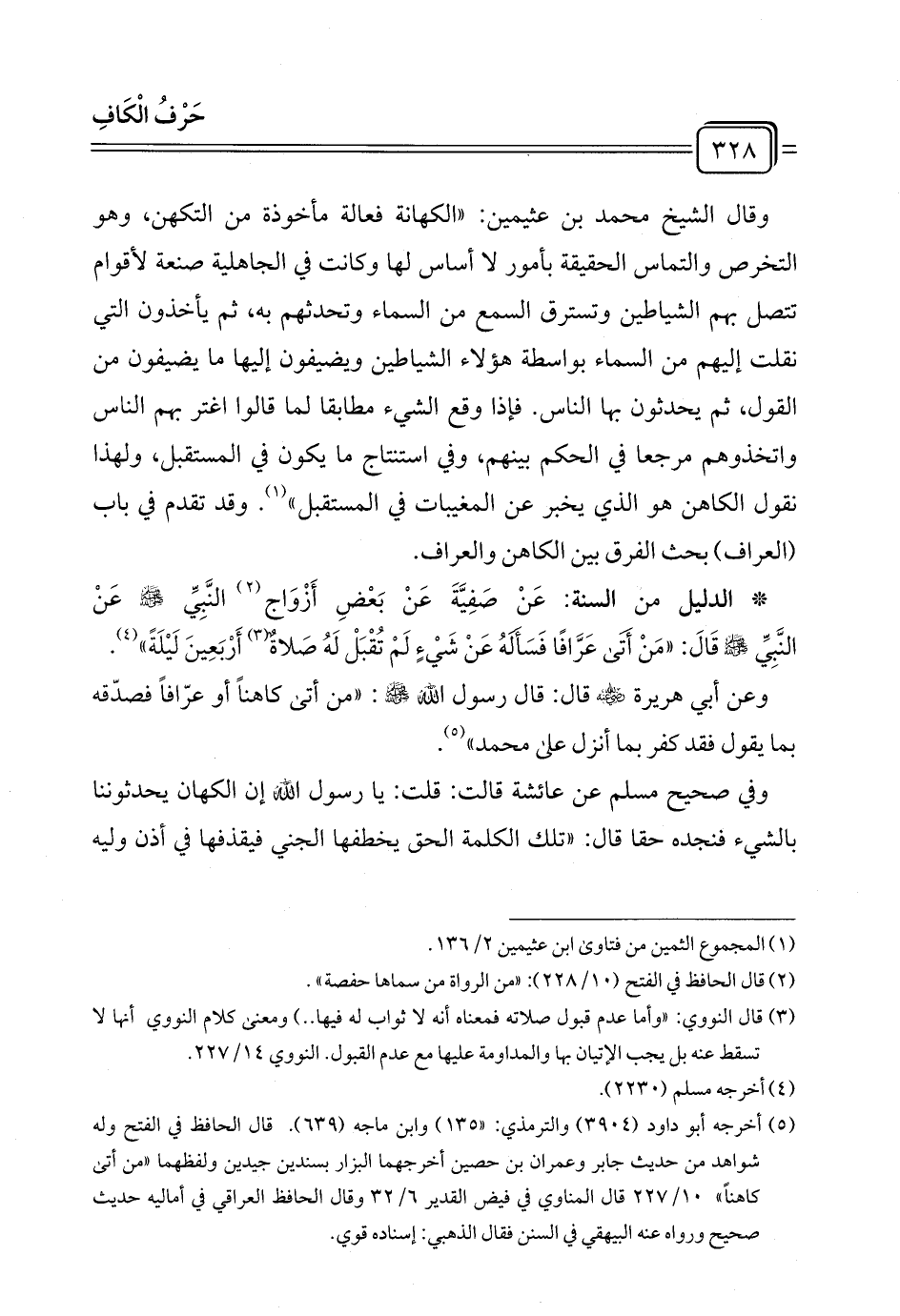 وعن أبي هريرة - رضي الله عنه - قال: قال رسول - صلى الله عليه وسلم -: "من أتى كاهنًا أو عرّافًا فصدّقه بما يقول فقد كفر بما أنزل على محمد" (¬٥).