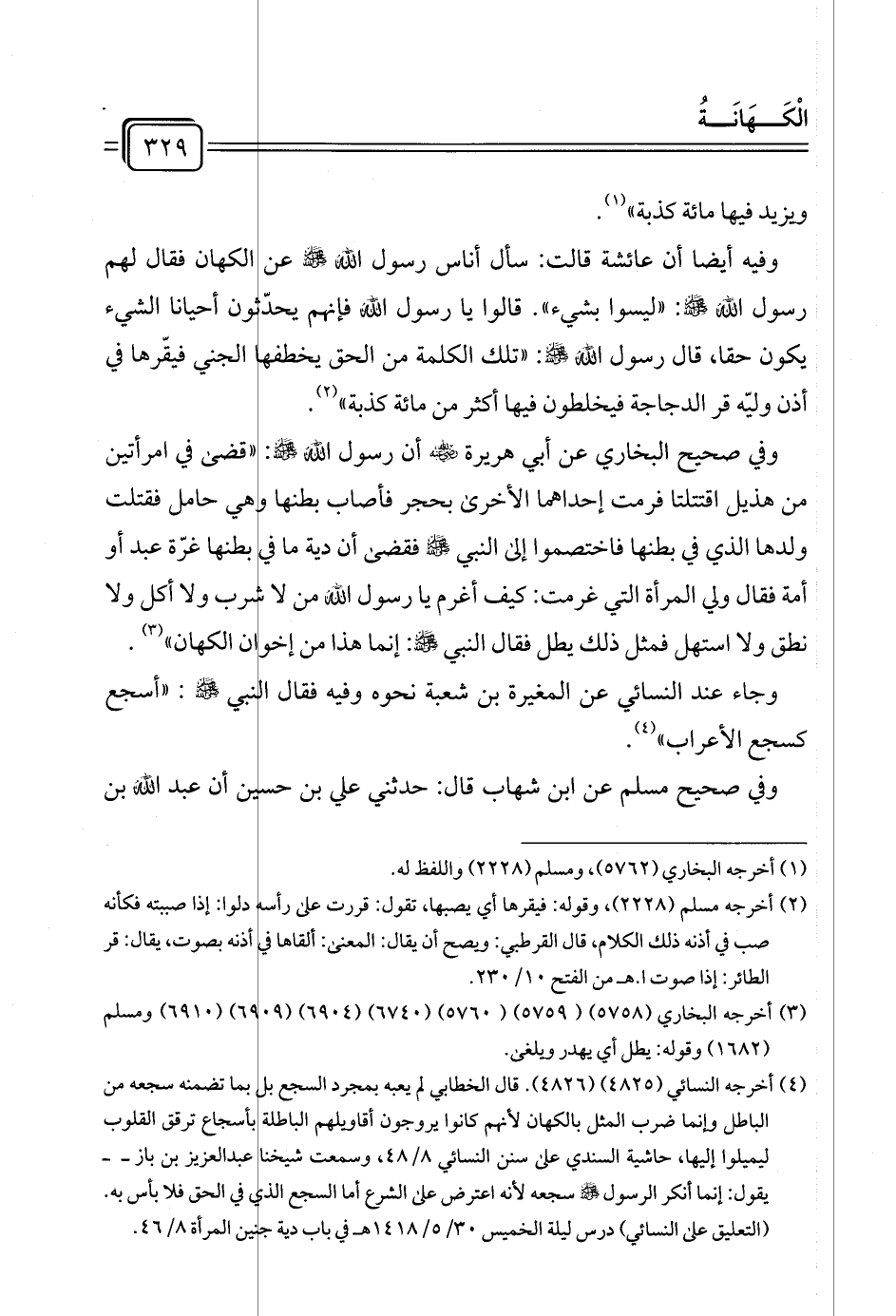 وفيه أيضا أن عائشة قالت: سأل أناس رسول الله - صلى الله عليه وسلم - عن الكهان فقال لهم رسول الله - صلى الله عليه وسلم -: "ليسوا بشيء". قالوا يا رسول الله فإنهم يحدّثون أحيانا الشيء يكون حقا، قال رسول الله - صلى الله عليه وسلم -: "تلك الكلمة من الحق يخطفها الجني فيقّرها في أذن وليّه قر الدجاجة فيخلطون فيها أكثر من مائة كذبة" (¬٢).