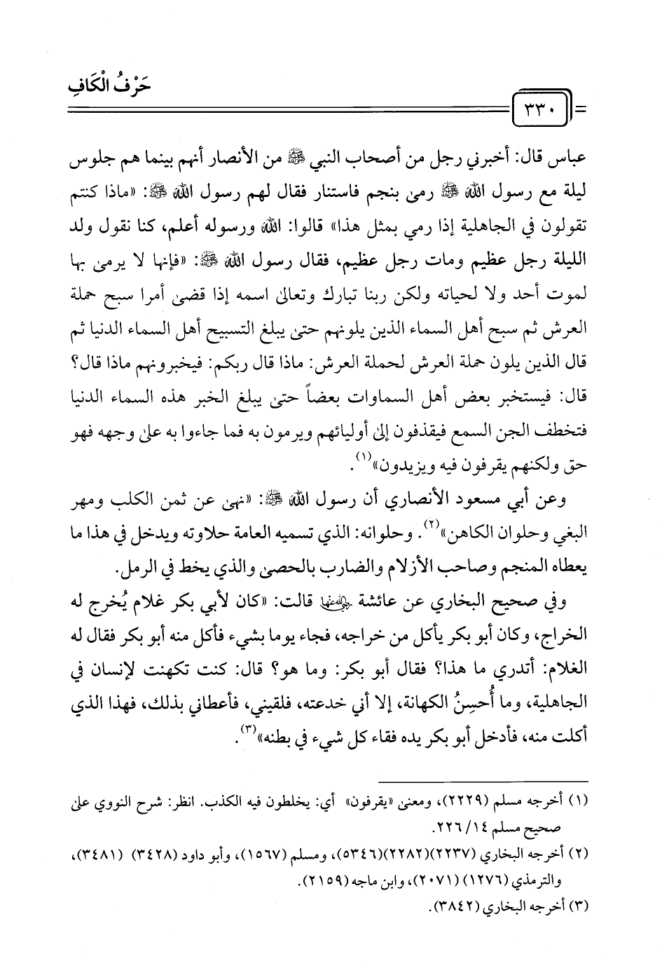عباس قال: أخبرني رجل من أصحاب النبي - صلى الله عليه وسلم - من الأنصار أنهم بينما هم جلوس ليلة مع رسول الله - صلى الله عليه وسلم - رمى بنجم فاستنار فقال لهم رسول الله - صلى الله عليه وسلم -: "ماذا كنتم تقولون في الجاهلية إذا رمي بمثل هذا" قالوا: الله ورسوله أعلم، كنا نقول ولد الليلة رجل عظيم ومات رجل عظيم، فقال رسول الله - صلى الله عليه وسلم -: "فإنها لا يرمى بها لموت أحد ولا لحياته ولكن ربنا تبارك وتعالى اسمه إذا قضى أمرا سبح حملة العرش ثم سبح أهل السماء الذين يلونهم حتى يبلغ التسبيح أهل السماء الدنيا ثم قال الذين يلون حملة العرش لحملة العرش: ماذا قال ربكم: فيخبرونهم ماذا قال؟ قال: فيستخبر بعض أهل السماوات بعضًا حتى يبلغ الخبر هذه السماء الدنيا فتخطف الجن السمع فيقذفون إلى أوليائهم ويرمون به فما جاءوا به على وجهه فهو حق ولكنهم يقرفون فيه ويزيدون" (¬١).